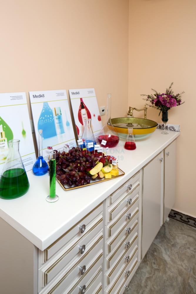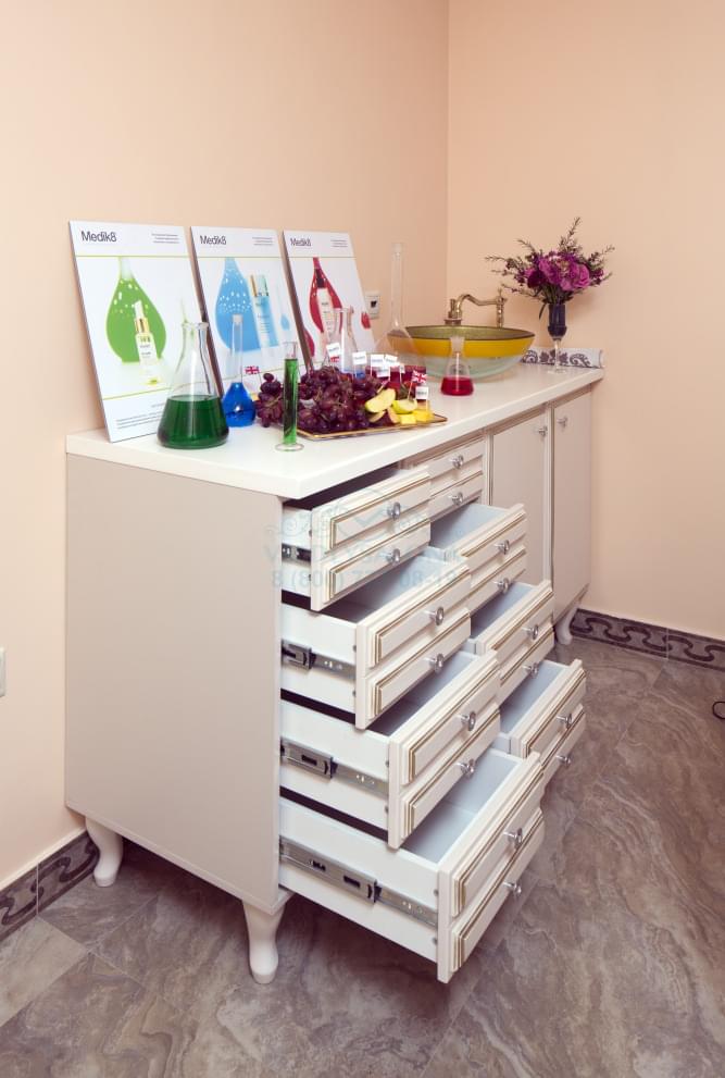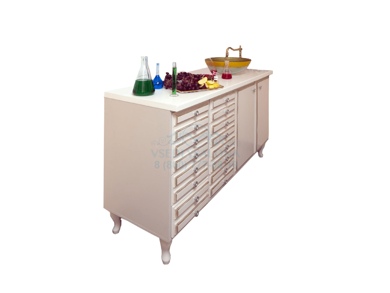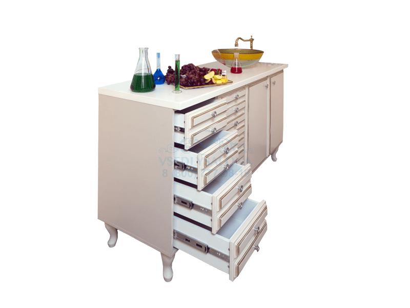 Лаборатория оборудована удобными открытыми полками и выдвижными ящиками и может быть дополнена мойкой из нержавеющей стали. Данный предмет интерьера позволит поместить все необходимые средства для работы наиболее оптимальным способом.