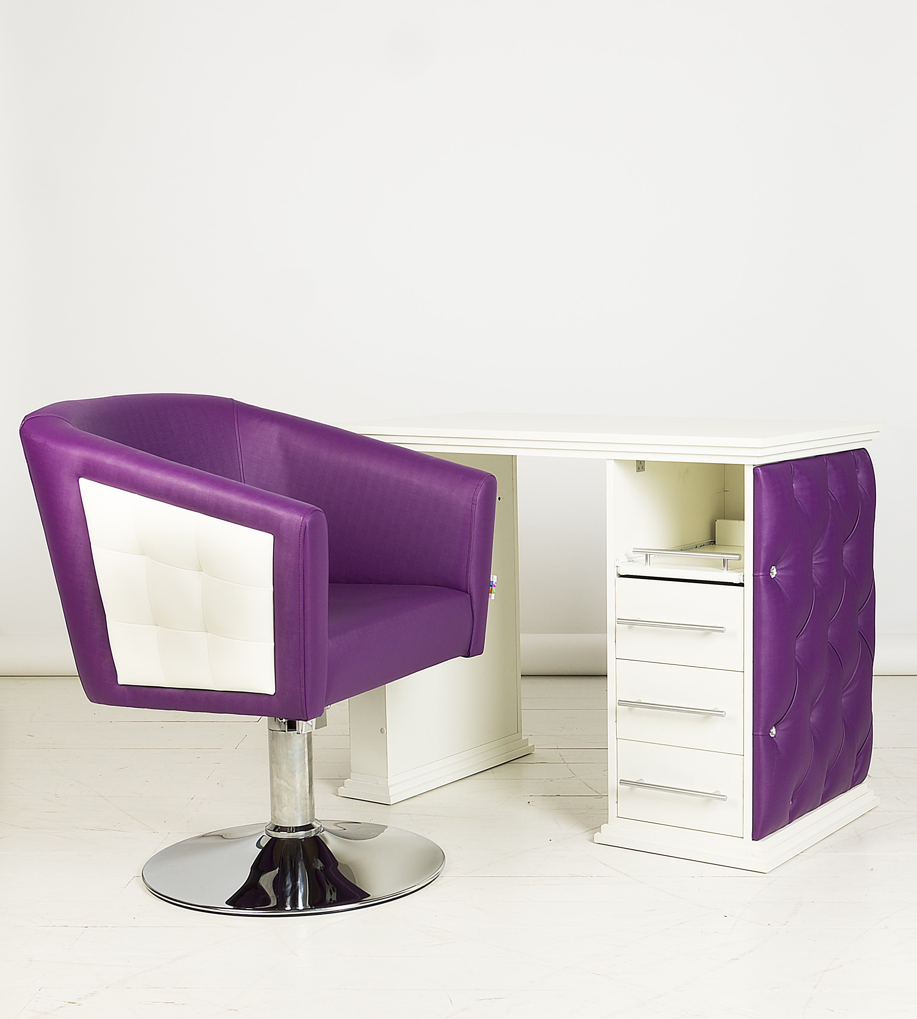 Кресло обшито экокожей высокого качества, материал не боится пятен от краски и укладочных средств. Все следы творческой работы мастеров легко удаляются с поверхности изделия.