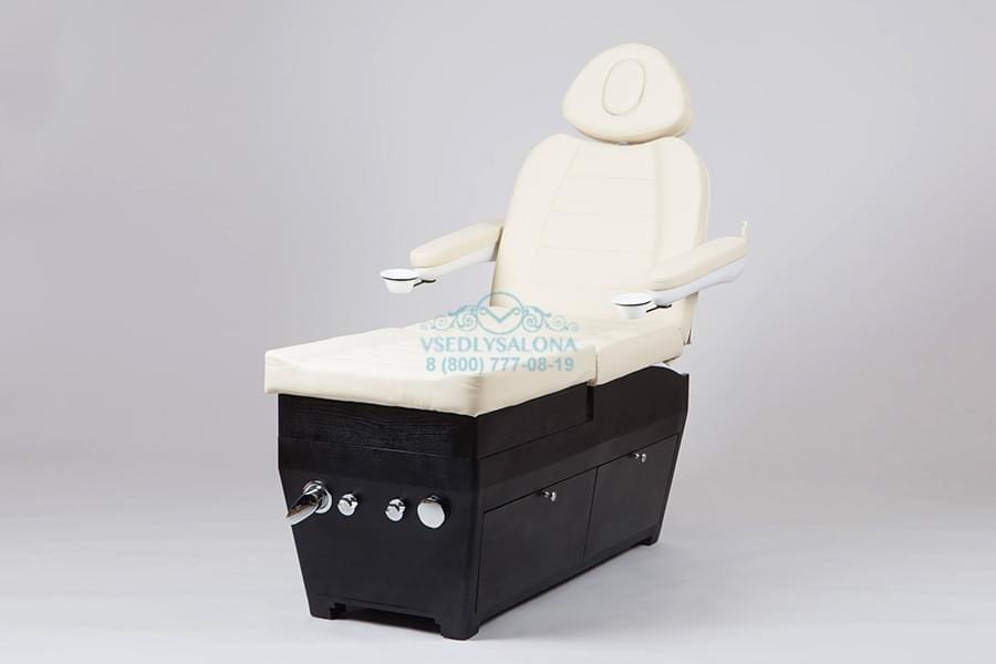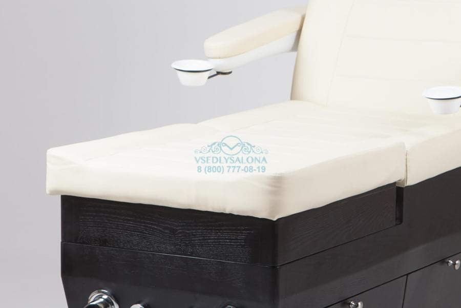 Эстетично красивое и многофункциональное кресло, которое представляет собой СПА комплекс, подходящий для маникюрных, педикюрных и косметологических процедур. При трансформации подойдет даже для массажа. Выполнено в число белом цвете из прочной эко кожи, благодаря чему идеально подойдет под любой интерьер даже самого модного салона. А деревянное основание, изготовленное из натурального дерева, имеет в себе ящик, который поможет спрятать все необходимые для процедур инструменты внутрь кресла и тем самым сэкономить пространство. Также в комплект входит съемная ножная подушка.