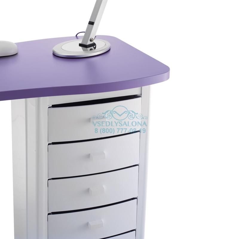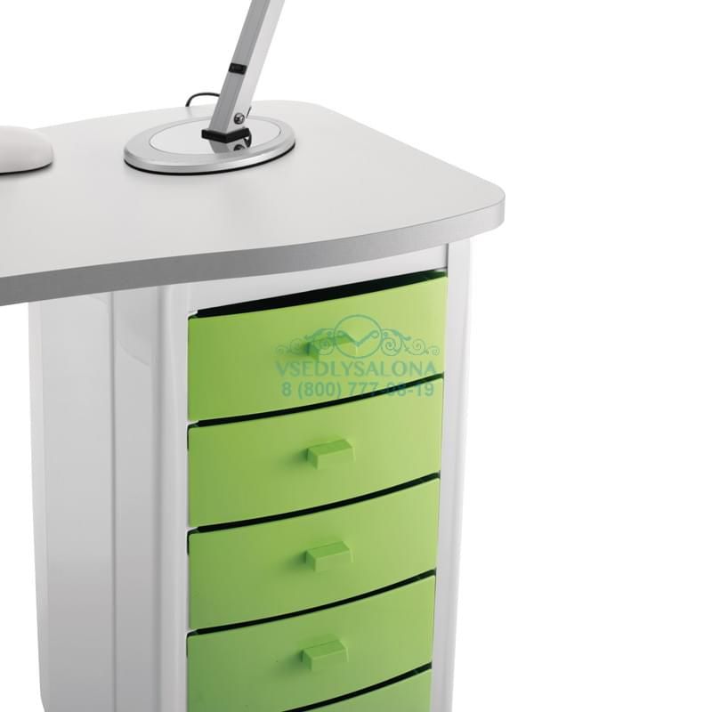 Маникюрный стол с одной тумбой, столешница ламинированная, тумба пластиковая с выдвижными ящиками, на колесах. В комплекте: лампа, подушка маникюрная, подставка под лаки, вытяжка AR1 20W.