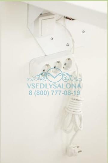 Тумба оснащена тремя выдвижными ящиками, нижний ящик идеально подходит для хранения высоких флаконов. Дополнительно стол оснащен тройной розеткой и удлинителем.