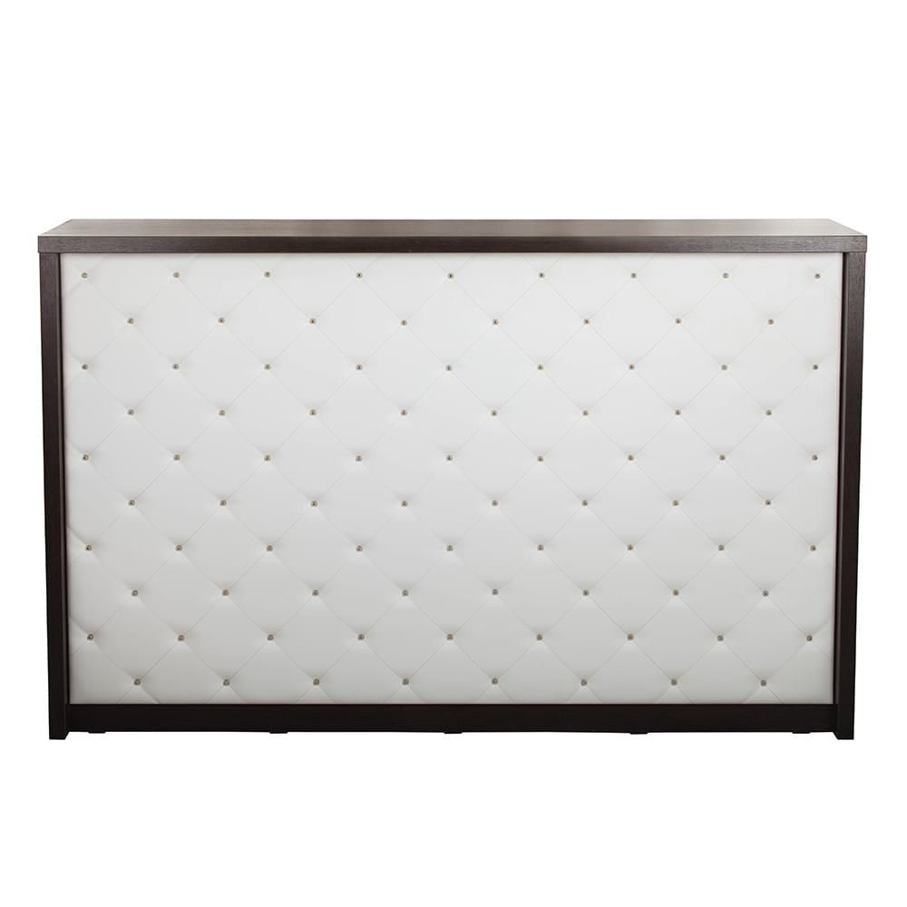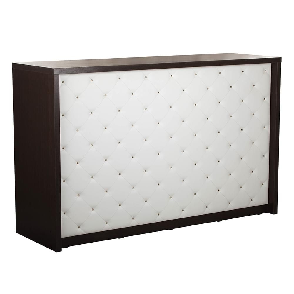 Администраторская стойка «Гламрок» выполнена в соответствующей стилистике – контрастные элементы, каретная стяжка с небольшим объемом, ярко выраженная геометрия и широкие возможности реализации индивидуального дизайна. Внешняя часть лишена мелких деталей, украшена стяжкой. Внутренняя – полноценное рабочее место для сотрудника салона.