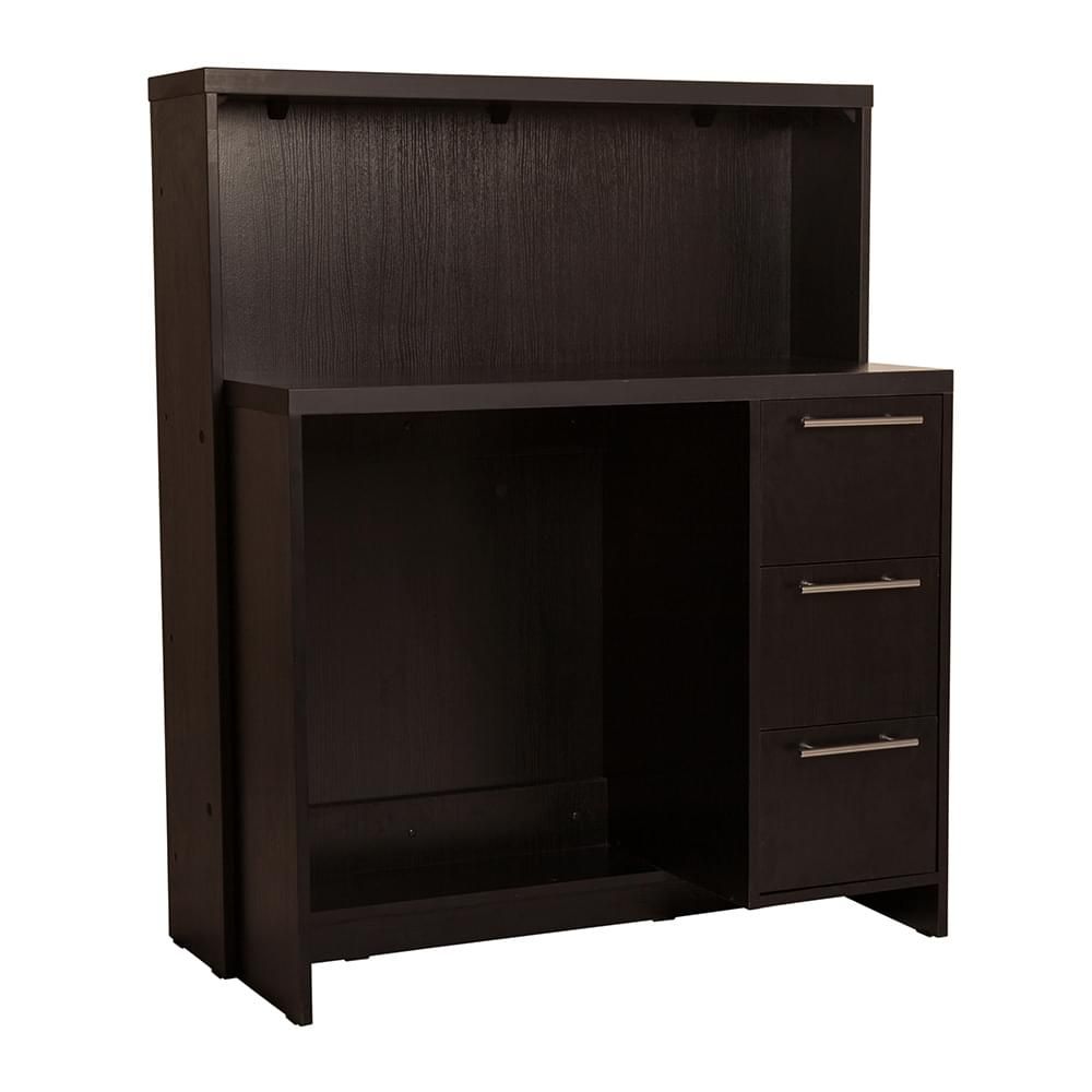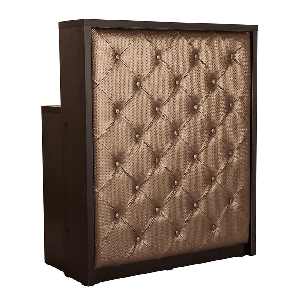 Стойка администратора «Мелодия» – элемент одноименного комплекта. Но ее можно купить и отдельно. Она выполнена на основе прочного долговечного ЛДСП, а обивка – каретная стяжка из кожзама, которая занимает практически всю площадь фронтальной поверхности. С внутренней стороны размещена рабочая площадь для администратора. Здесь можно расположить ноутбук, телефон, документы, канцелярию и прочее – все, что только может понадобиться в работе.