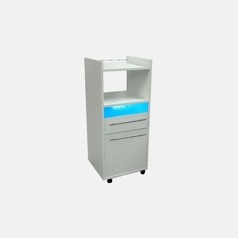 Тумба Сэвино устроена таким образом, что с её помощью можно не только усовершенствовать рабочий процесс мастера салона, но и сделать пространство эргономичнее. Для этого, конструкция снабжена бактерицидной УФ лампой, благодаря которой есть возможность стерилизовать инструменты в кратчайшие сроки, а также хранить их на протяжении семи дней без повторной эксплуатации. Мебельное изделие дополнено выдвижным ящиком, а также большим ящиком с ручкой для хранения дополнительных мелочей, которые не должны быть на ввиду у посетителей. Также, конструкция располагается на передвижных колесиках, что упрощает её эксплуатацию.