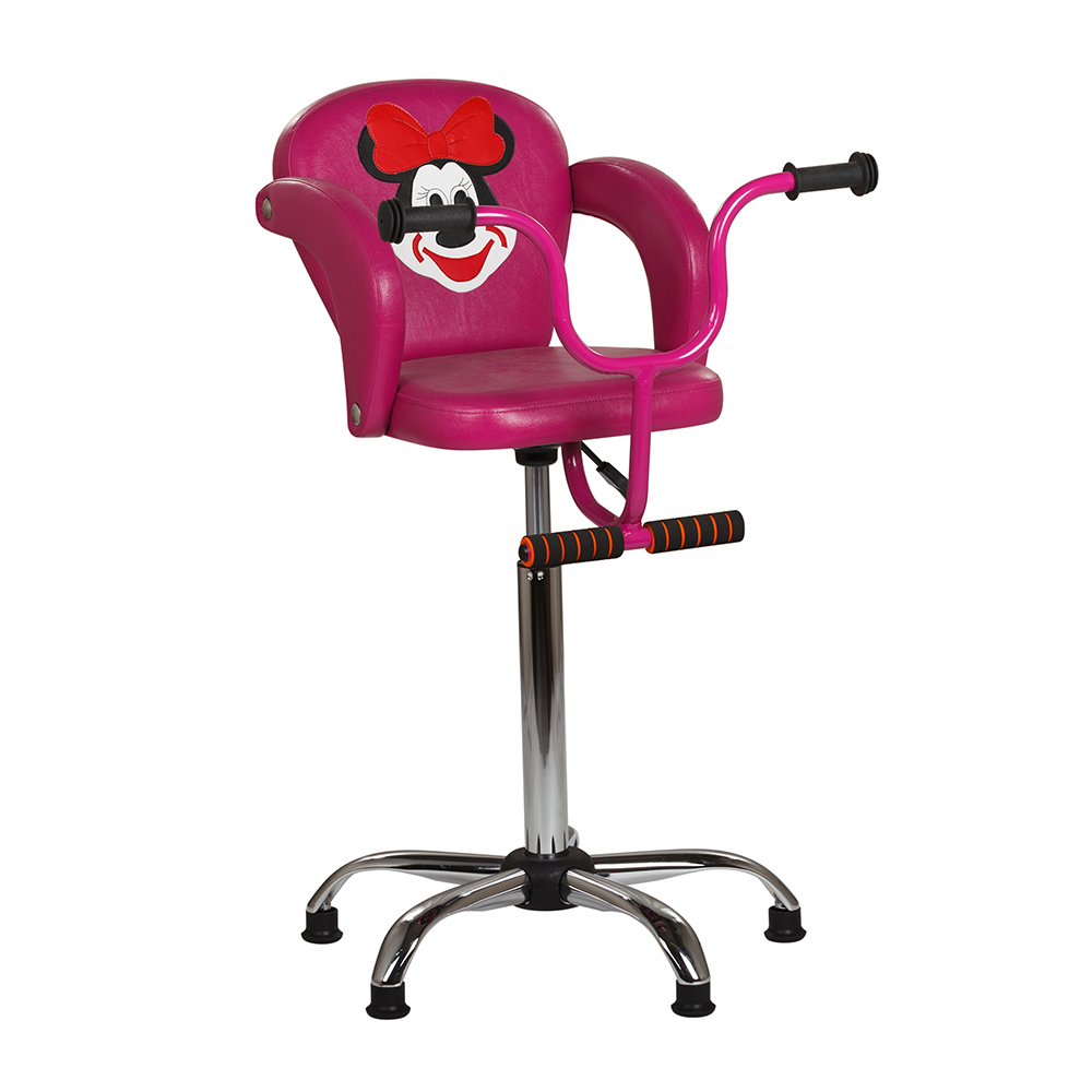 Комплектуется только хромированным основанием с высокой пневматикой. Изогнутый руль, как у велосипеда, выполняет функцию ручки за которую ребенок может держаться, имеется подставка под ноги. Мягкая спинка и подлокотники выполнены из поролона и обтянуты винилискожей, что позволяет ребенку чувствовать себя комфортно длительное время.