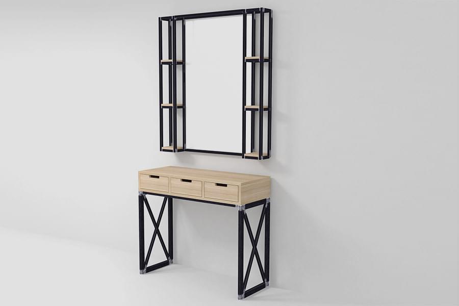 Консоль для зеркала Adrian — сочетание минимализма и стиля лофт. Консоль для зеркала Adrian может использоваться как в комплекте с зеркалом Adrian, так и самостоятельно: в качестве стола, подставки под различные инструменты и принадлежности. Имеются ящики с пазами вместо ручек. Каркас и ящики выполнены из фанеры, тонированы по собственной технологии, покрыты лаком на водной основе. Сварные швы на ножках зачищены. Металлические элементы покрыты двухкомпонентным лаком.