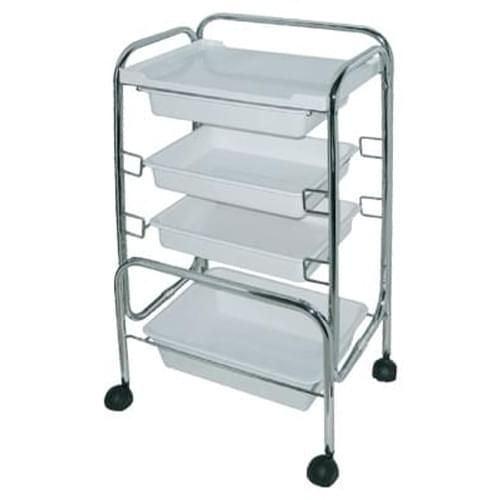 Столик косметологический на колесиках для профессионального использования на металлическом каркасе с тремя полками из белого металла или стекла с бортиками по краям и отверстиями для лампы-лупы. Подходит в кабинеты: косметологический, педикюрный, массажный и СПА процедур.