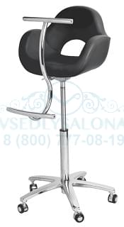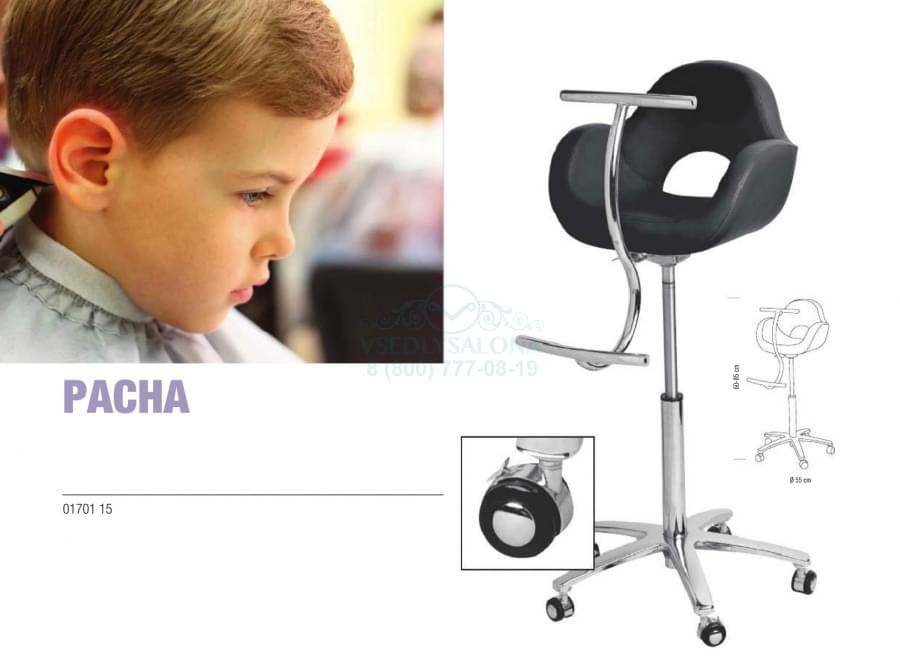 Парикмахерское кресло для детей PACHA чёрного цвета; комплектуется пневматикой для регулировки высоты, металлической подножкой и хромированным пятилучьем на колесиках. Пр-во Бельгия.