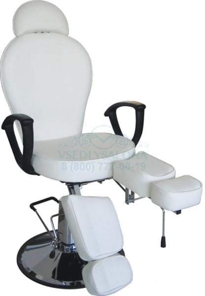 Педикюрное кресло класса ЭКОНОМ. Регулировка высоты с помощью гидроподъемника, механическая регулировка наклона спинной и подножных частей. Кресло оснащено выдвижным подголовником и эргономичными подлокотниками черного цвета из пластика.