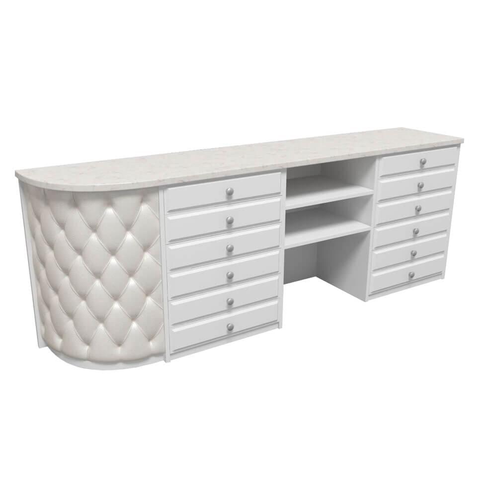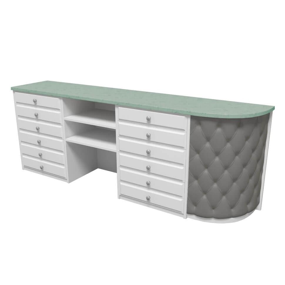 Администраторская стойка «Соната» сразу же привлекает к себе внимание. Каретная стяжка с мягкой текстурой выглядит современно и стильно, придает вашему заведению статуса и изысканности. Дополнительный эффект достигается за счет использования элегантных резных ножек, выступающих в роли некоего акцентного элемента. Со стороны администратора практически всю площадь занимают полочки и дверки, где можно разместить все для работы и личные вещи, если надобность в этом есть. Цвета отделки можно выбрать практически любые, что позволяет реализовать самые креативные идеи и придать вашей парикмахерской или салону красоты больше индивидуальности.