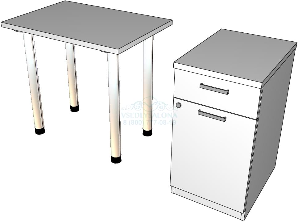 Материал и комплектация: столешница из ЛДСП (любого цвета) опоры металлические (хром) возможность раздельного использования стола и тумбы силовой каркас тумбы из ЛДСП (любого цвета) фасадная часть тумбы из ЛДСП (любого цвета) в тумбе 1 выдвижной ящик на роликовых направляющих