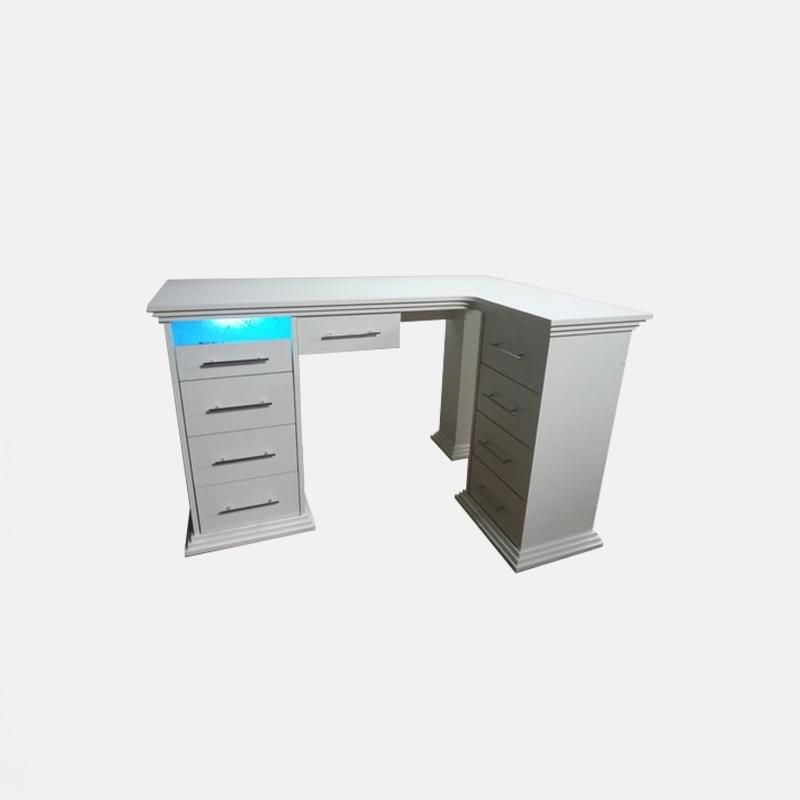 Главная особенность маникюрного стола Time – его угловая форма. За счет этого столик занимает относительно немного места и является более практичным, чем аналоги. В мастера в распоряжении будет большая столешница, две вместительные тумбы и дополнительный выдвижной ящик.