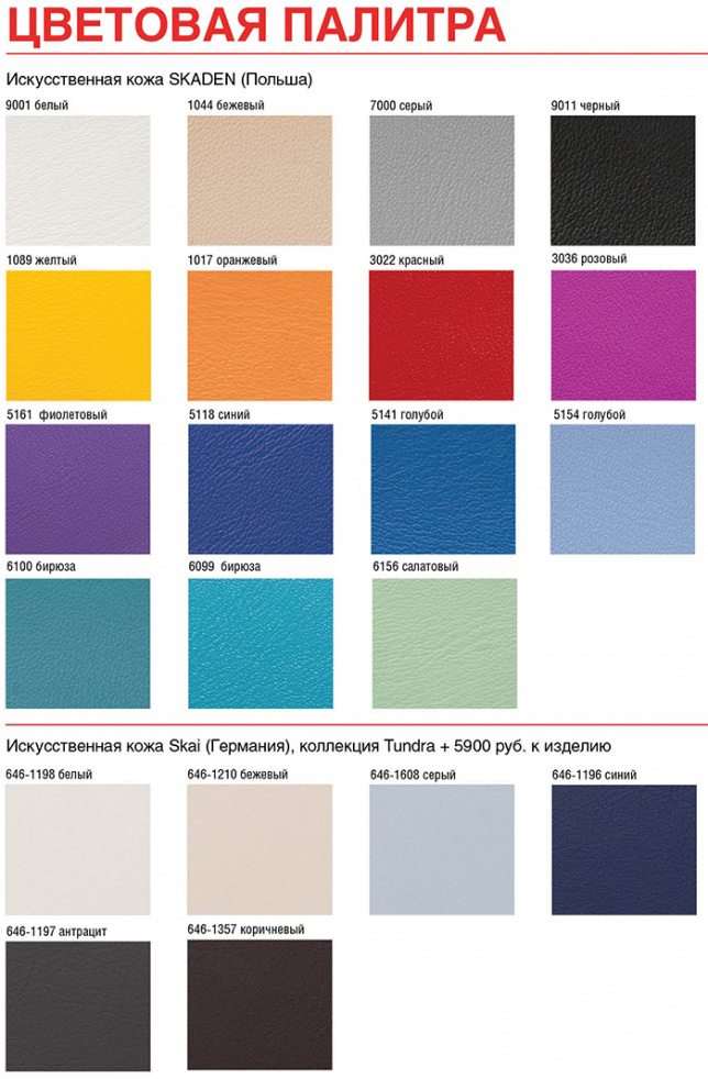 Ложе и секции выполнены из фанеры, поролона, покрыты искусственной кожей, устойчивой к истиранию, химическим дезинфектантам и УФ-излучению. Технология обтяжки - без швов, облегчающая процесс чистки и санобработки. Цвет обивки – по желанию заказчика.