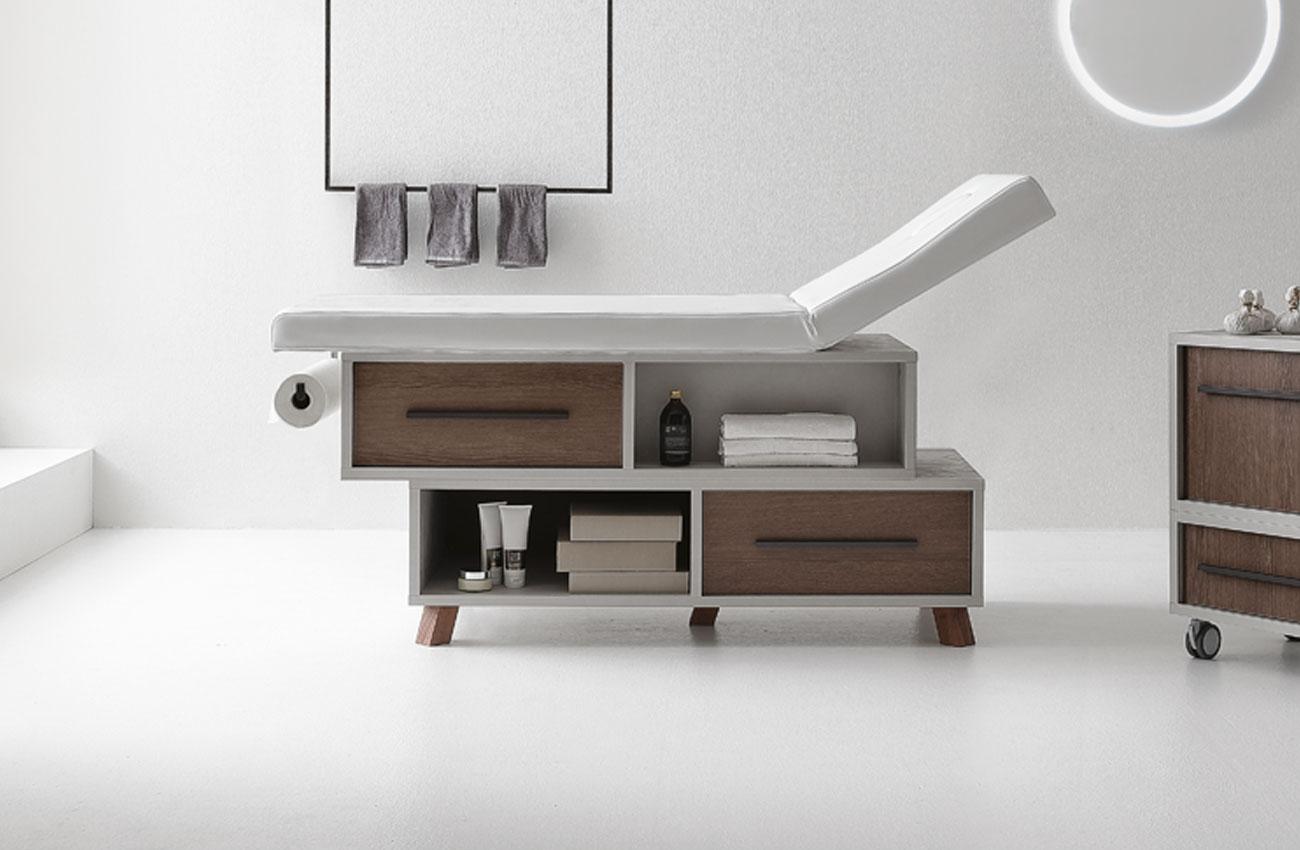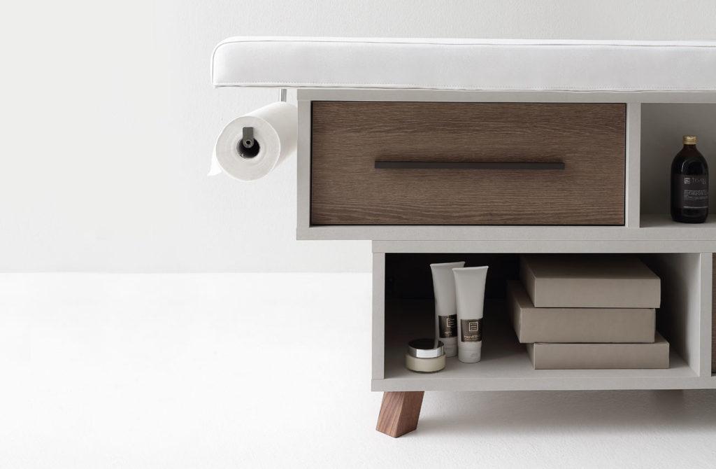 Массажная кушетка "The Wall" - оборудована двумя выдвижными ящиками, выдвижной полкой для косметического оборудования, экспозиционными отсеками для продуктов, большим отсеком для оборудования. Фронтальные ящики оснащены алюминиевыми ручками, отделка свинцово-черная. Регулируемая спинка. Оснащена держателем рулона и деревянными ножками.