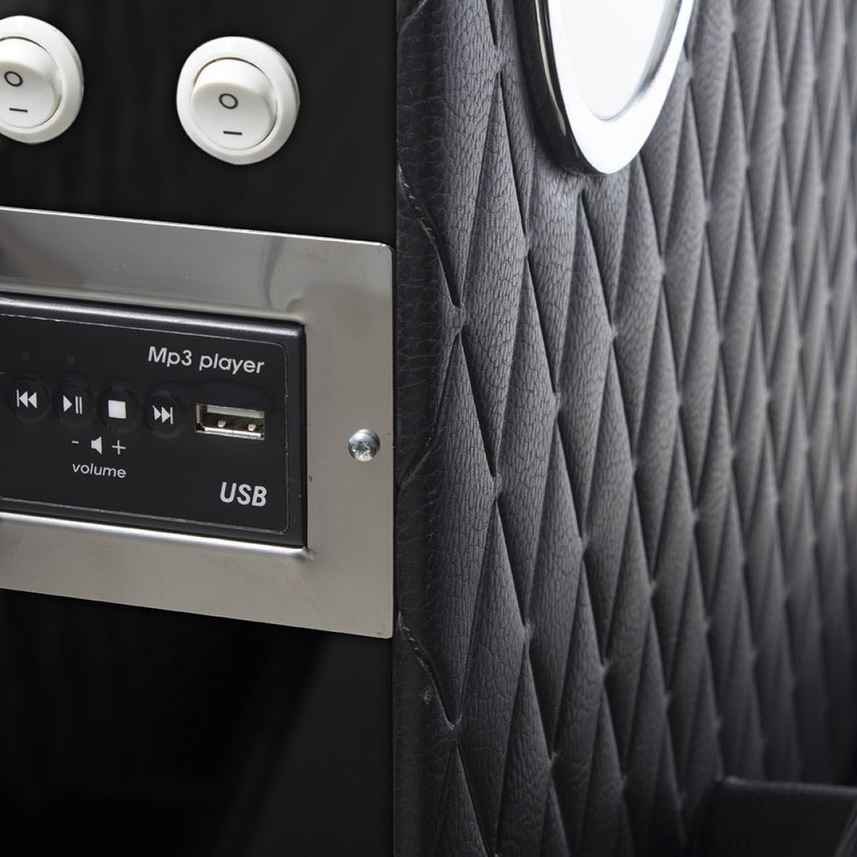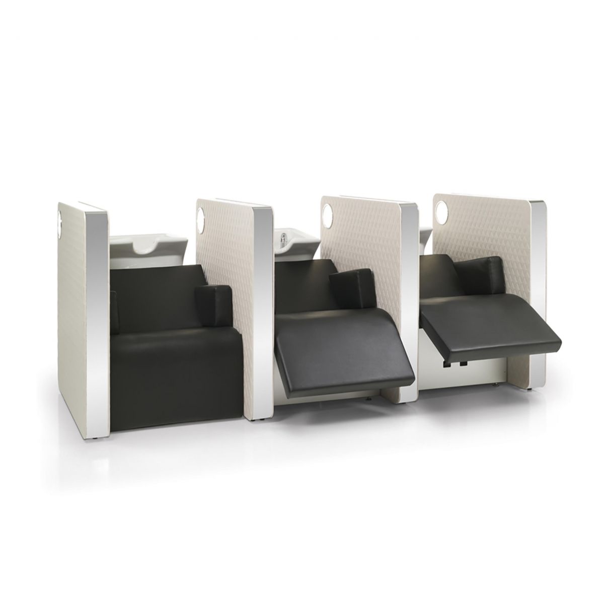 Мойка парикмахерская "VIP LOUNGE 3P" - трехместная с высоким уровнем комфорта и приватной зоной. Мойка оснащена мягкими и комфортными подлокотниками и системой воздушного массажа AIR-SHIATSU. Также мойка с артикулом G-м60002638 оснащена электрической регулировкой сидения, спинной части и опоры для ног. Движения синхронизированные, что позволяет клиенту принять положение "полулежа" обеспечивая максимальный комфорт. Мойка комплектуется глубокой керамической раковиной с регулировкой угла наклона и комплектом смесителя. Обивка - искусственная кожа высшего качества. Отделка боковин - исскуственная кожа коллекции "PRIVACY COLLECTION" или акрил. Окантовка боковин - сталь.