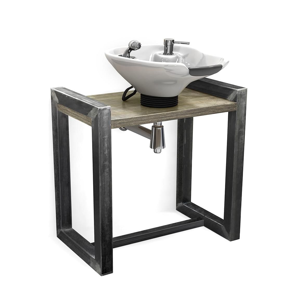 С установленной мойкой с узлом наклона для использования в барбершопах и парикмахерских.