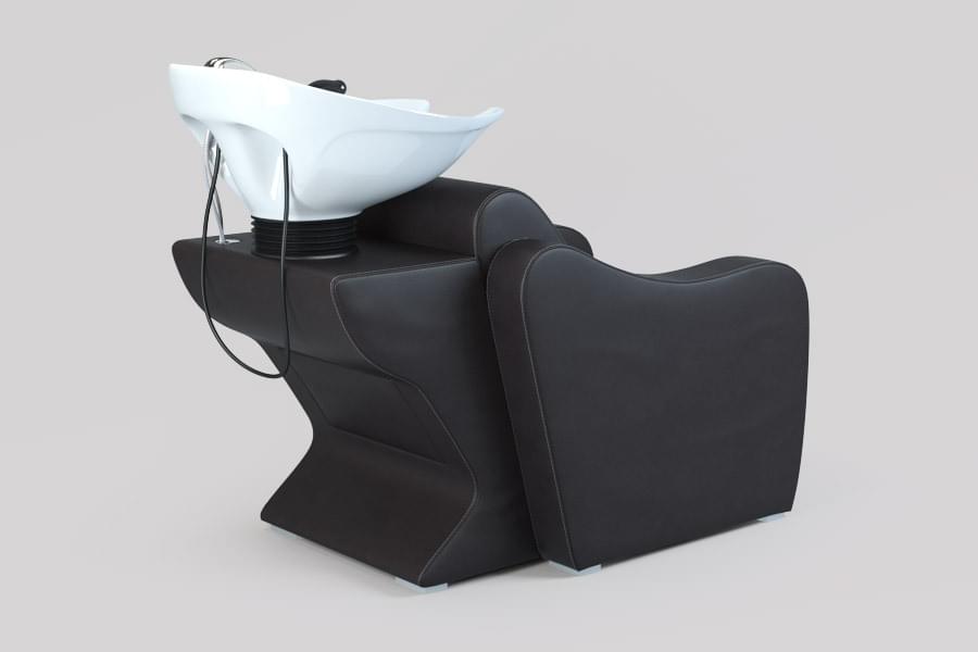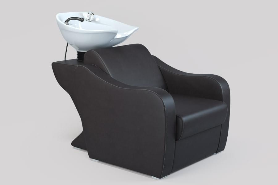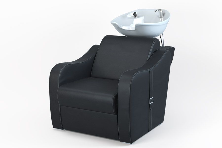 Подстраиваясь под клиента, раковина поднимается и опускается, принимая нужное положение. Стильное основание изготовлено с эргономичной спинкой и удобными мягкими подлокотниками, сиденье – широкое: все для того, чтобы клиенту было максимально комфортно. Боковая часть оформлена элегантным ремешком с пряжкой, по краю материал оформлен качественной строчкой – эти нюансы делают модель красивой и современной, моментально привлекая внимание посетителей.