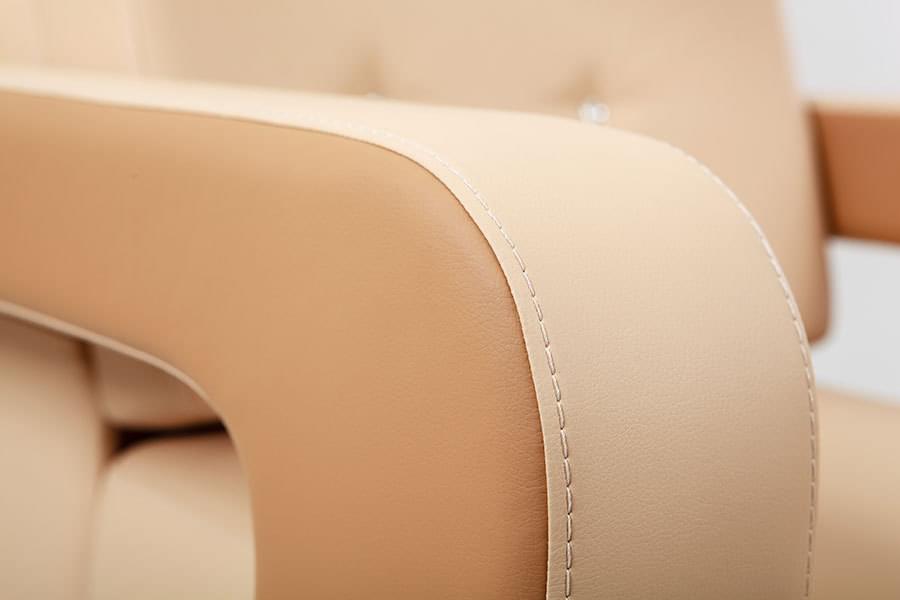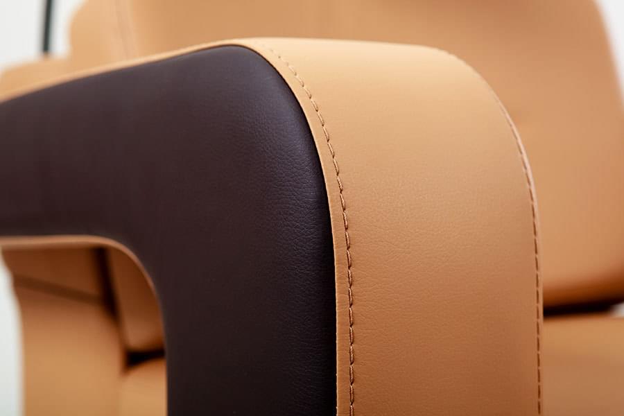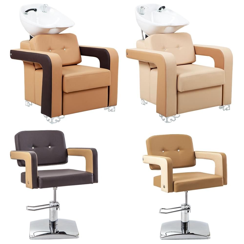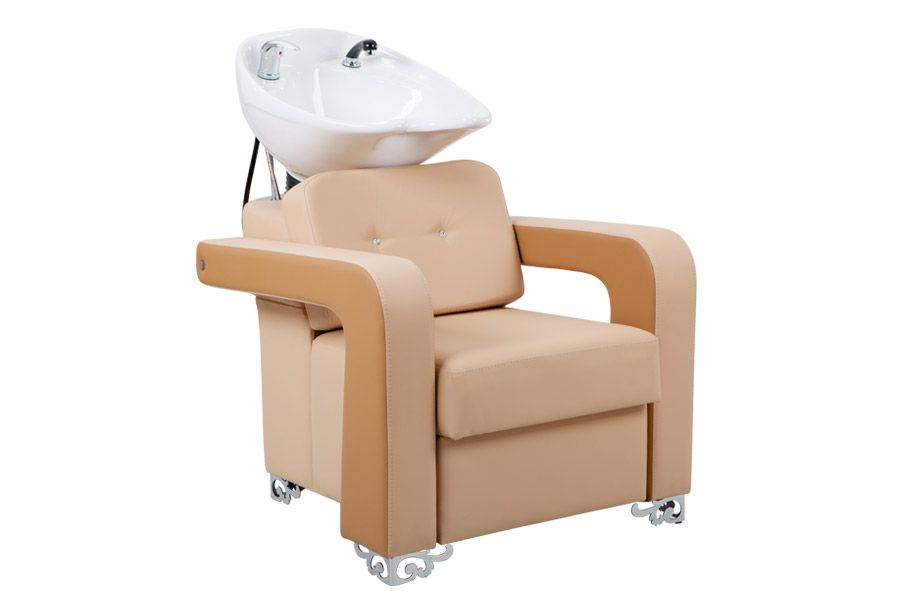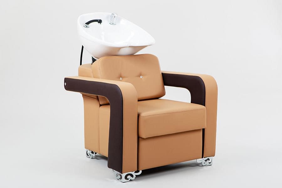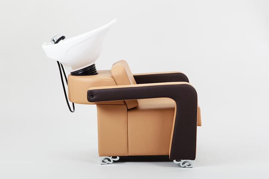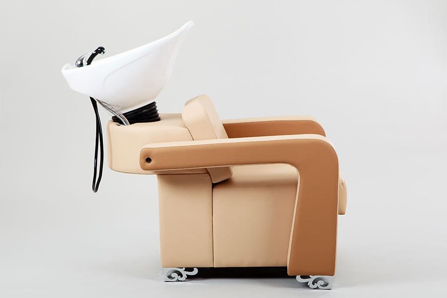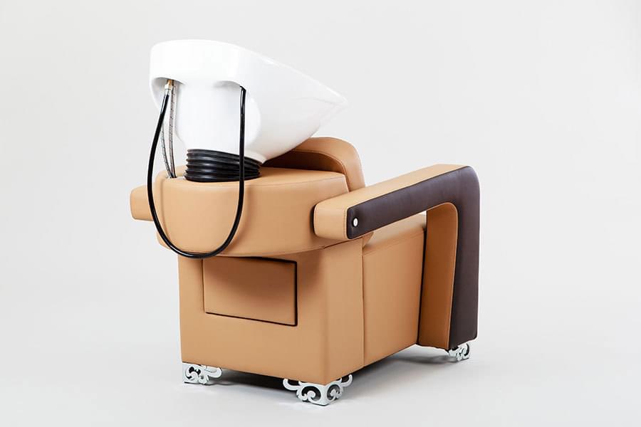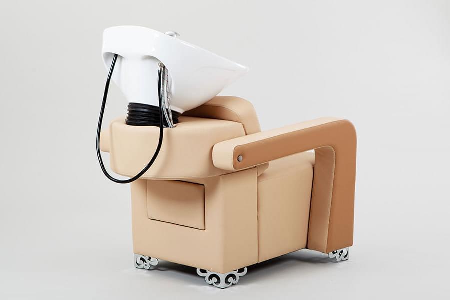 Кресло с необычными подлокотниками, фигурными ножками и блестящей фурнитурой функционально дополнила глубокая мойка, подстраивающаяся под клиента. Мойка подойдет для волос любой длины; сиденье кресла вместительное и достаточно широкое; руки клиента удобно размещаются на подлокотниках. Шикарная парикмахерская мойка для салона, который требовательно относится ко всему, что касается комфорта своих посетителей.