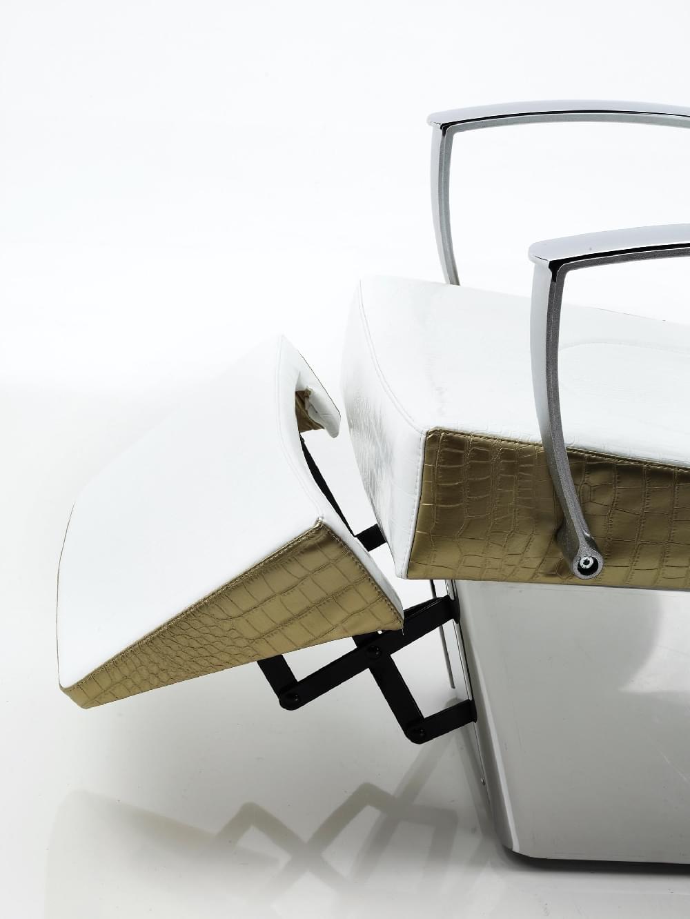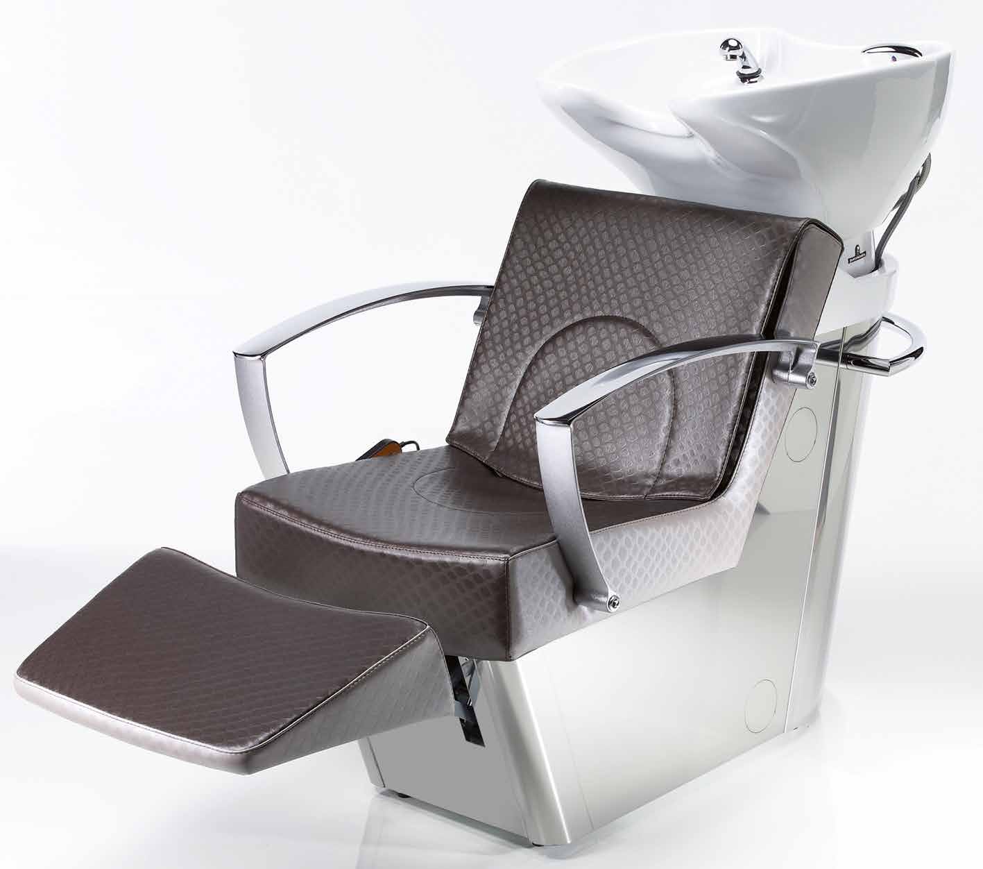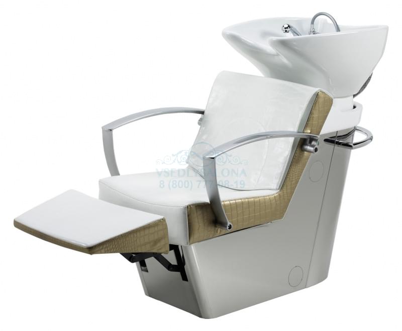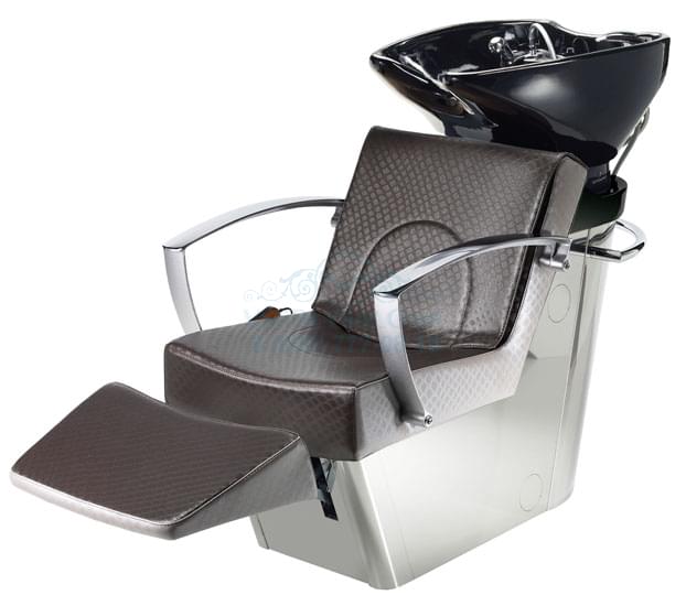 Мойка с креслом на алюминиевом каркасе. Комплектуется средней, глубокой керамической раковиной белого или черного цвета, с регулировкой угла наклона, комплектом смесителя с хромированной лейкой душа. Каркас кресла выполнен из металла, мягкие элементы обтянуты искусственной кожей высшего качества, кресло с электрической подножкой, легкое управение с помощью ручного пульта. Подлокотники хромированные. Возможен вариант с электической подножкой и воздушным массажем или без подножки и без массажа.