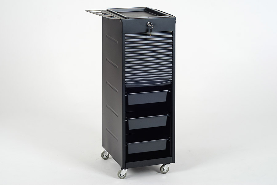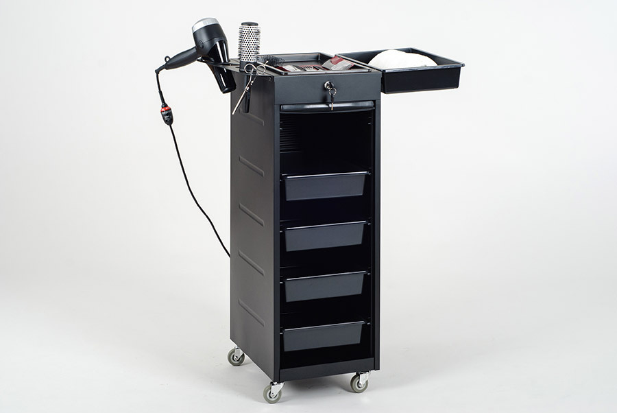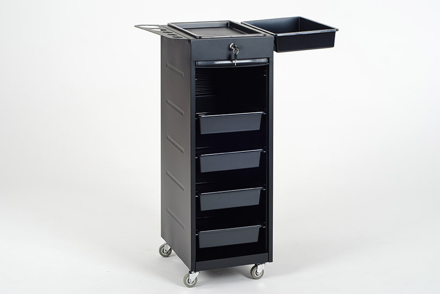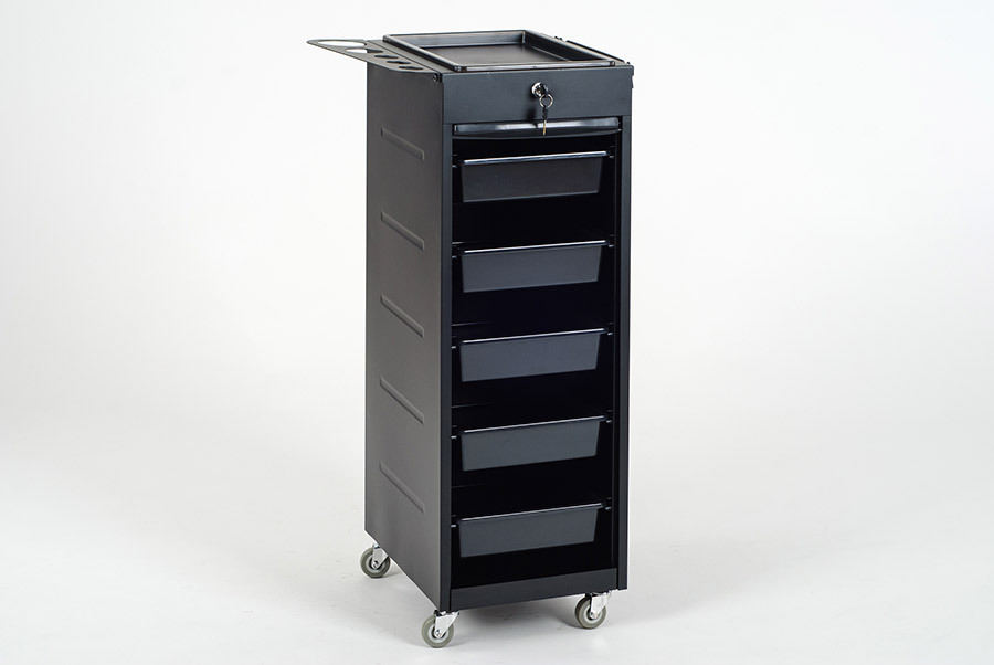 Модель закрытого типа, секция с ящиками запирается на замок. Корпус тележки изготовлен из металла, что обеспечивает долгий срок службы изделия. Пять вместительных ящиков для хранения парикмахерских принадлежностей и инструментов. Столешница оборудована держателем инструментов с пятью отверстиями разного диаметра (от 38 до 80 мм). На столешнице можно закрепить один из ящиков, увеличив рабочую площадь. Прорезиненные колеса обеспечивают легкое и бесшумное перемещение тележки.