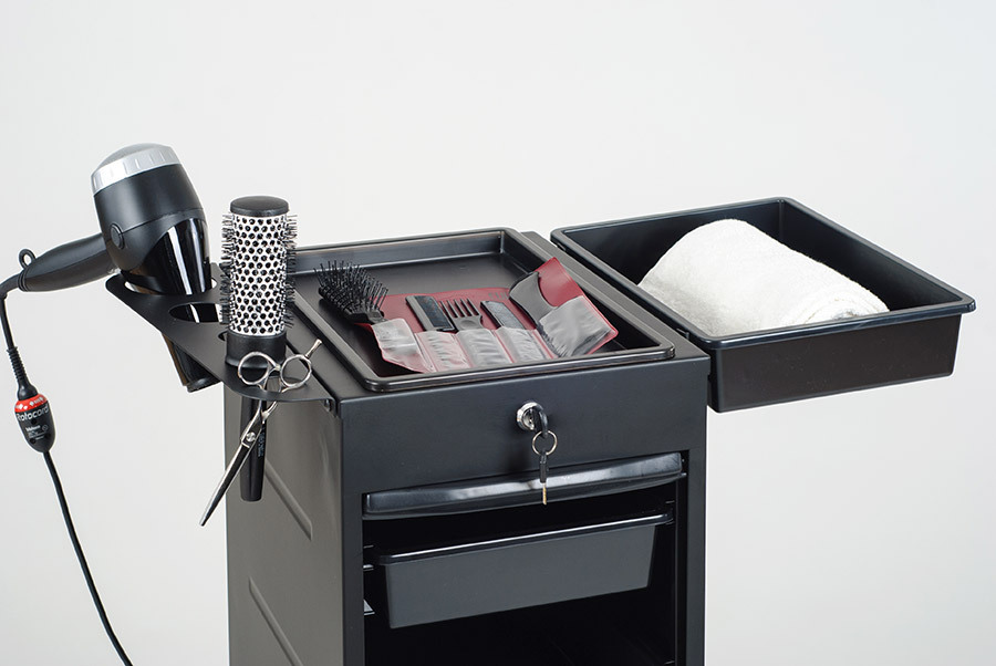 Парикмахерская тележка Т-30 оснащена глубокими и вместительными ящиками для парикмахерских принадлежностей, а также фенодержателем для еще большего удобства работы. Она выполнена в классическом черном цвете, что делает ее универсальной моделью практически для любой современной парикмахерской или барбершопа.