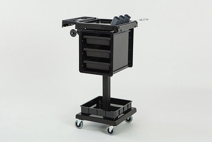 Парикмахерская тележка "QA0016" с внешним держателем для фена и полотенец. Каркас выполнен из прочной металлической основы, остальные части – из толстого ударопрочного пластика. Столешница поделена на секции и имеет специальные стаканы из теплостойкого пластика для горячих ножниц, плоек и выпрямителей. Для хранения инструментов предусмотрены три выдвижных ящика, которые можно закрепить на столешнице. Особенность конструкции – специальный держатель для фольги.