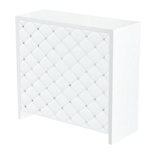 Все предметы выполнены в одном стиле, изюминкой дизайна является каретная стяжка. Ее особенность заключается в использовании стразов вместо мебельных гвоздиков. Мебель и зеркала обшиты искусственной износостойкой кожей, каркас изготовлен из ламинированного ДСП, металлические элементы – из хромированной стали.
