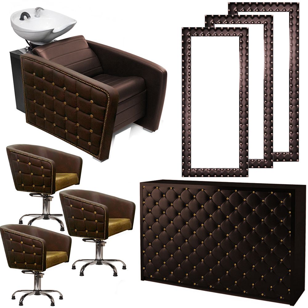 Парикмахерский комплект «Мелодия» - отличный вариант для обустройства барбершопа или интерьера салона в стиле ретро. В комплект входит стойка администратора, одностороннее зеркало в полный рост, мойка с креслом и парикмахерское кресло. Обивка мягких элементов изготовлена из искусственной кожи. Элементом декора выступает каретная стяжка, в которой используются крупные мебельные гвоздики золотистого цвета. Основание парикмахерского кресла изготовлено из хромированной стали. Каркас стойки администратора и другие деревянные элементы изготовлены из ламинированного ДСП.
