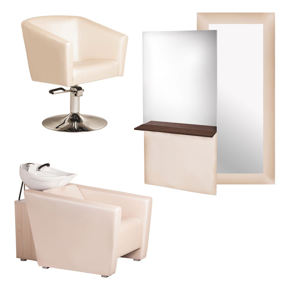 Парикмахерский комплект «Саида» состоит из четырех предметов: парикмахерского кресла, парикмахерской мойки и двух парикмахерских зеркал разного дизайна. Мебель и зеркала выполнены в пастельной цветовой гамме, в качестве обивки используется искусственная кожа. Каркас изготовлен из ДСП, металлические элементы – из хромированной стали.