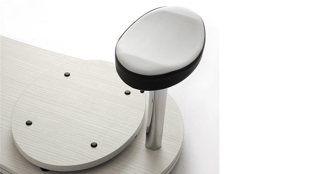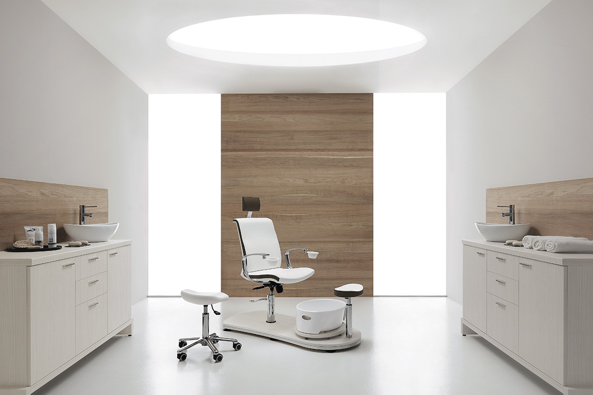 Оборудование оснащено съемной ванной для педикюра и функциональной подставкой для ног, регулируемой по высоте и глубине. Основание выполнено из фанеры и хромированной стали. Возможные варианты исполнения основания – дуб бардолино, натуральный венге, белая лиственница. Устойчивость обеспечивают противоскользящие резиновые накладки.