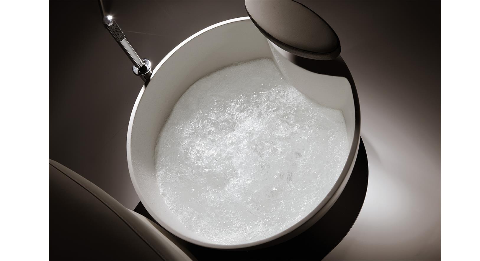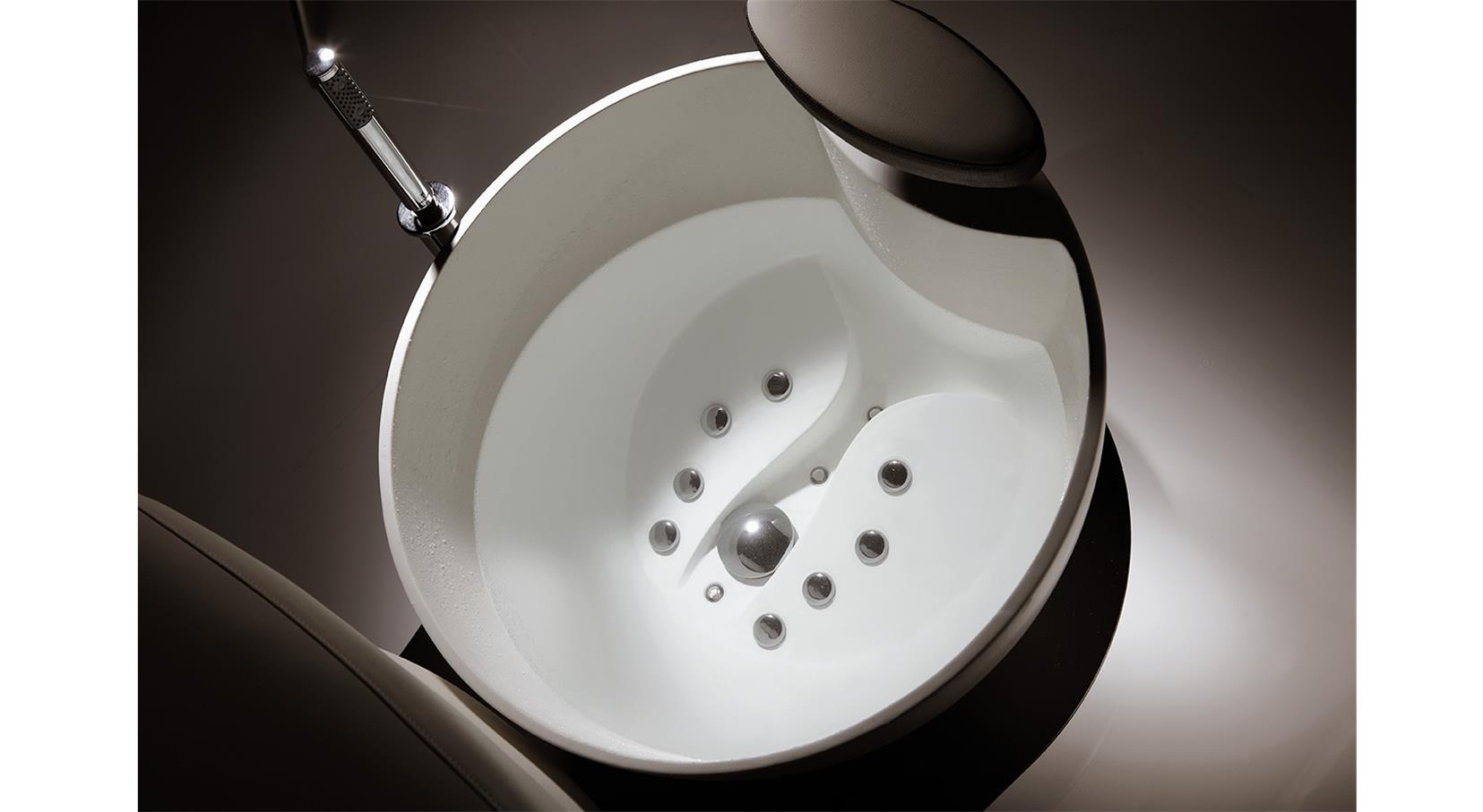 Ванна выполнена из белого материала, который легко очищается. Она оснащена душем и смесителем. Подставка для ног регулируется по высоте и глубине. Кресло обшито мягкой искусственной кожей, основание выполнено с использованием хромированной стали.