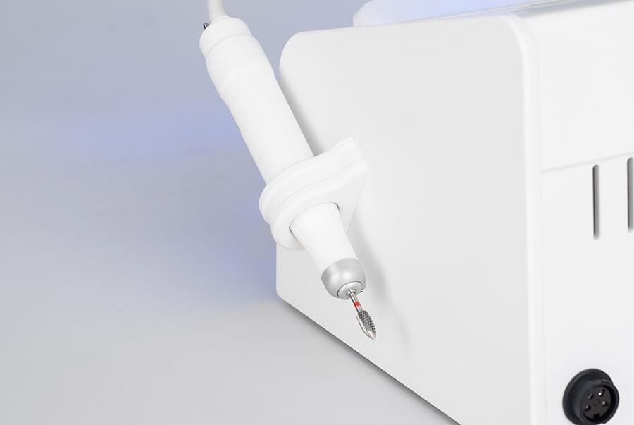 Аппарат оборудован усовершенствованным встроенным пылесосом и эргономичным наконечником со встроенной LED подсветкой с тремя светодиодами. Модель оснащена тремя настраиваемыми ячейками памяти для быстрого перехода к собственным настройкам скорости вращения фрезы и мощности всасывания пылесоса. Все настройки педикюрного аппарата регулируются при помощи сенсорного дисплея на лицевой панели.