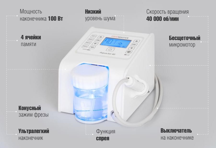 Профессиональный аппарат для педикюра "Podomaster AquaJet 40" оснащен мощным спреем. Мощность микромотора в наконечнике модели — 100 Вт, а скорость вращения составляет 40 000 об/мин. Устройство оснащено спреем со специальной легкосъемной емкостью для жидкости. Аппарат имеет большой информативный экран и оборудован ультралегким наконечником с бесщеточным мотором, который можно закрепить в специальном боковом держателе на корпусе.
