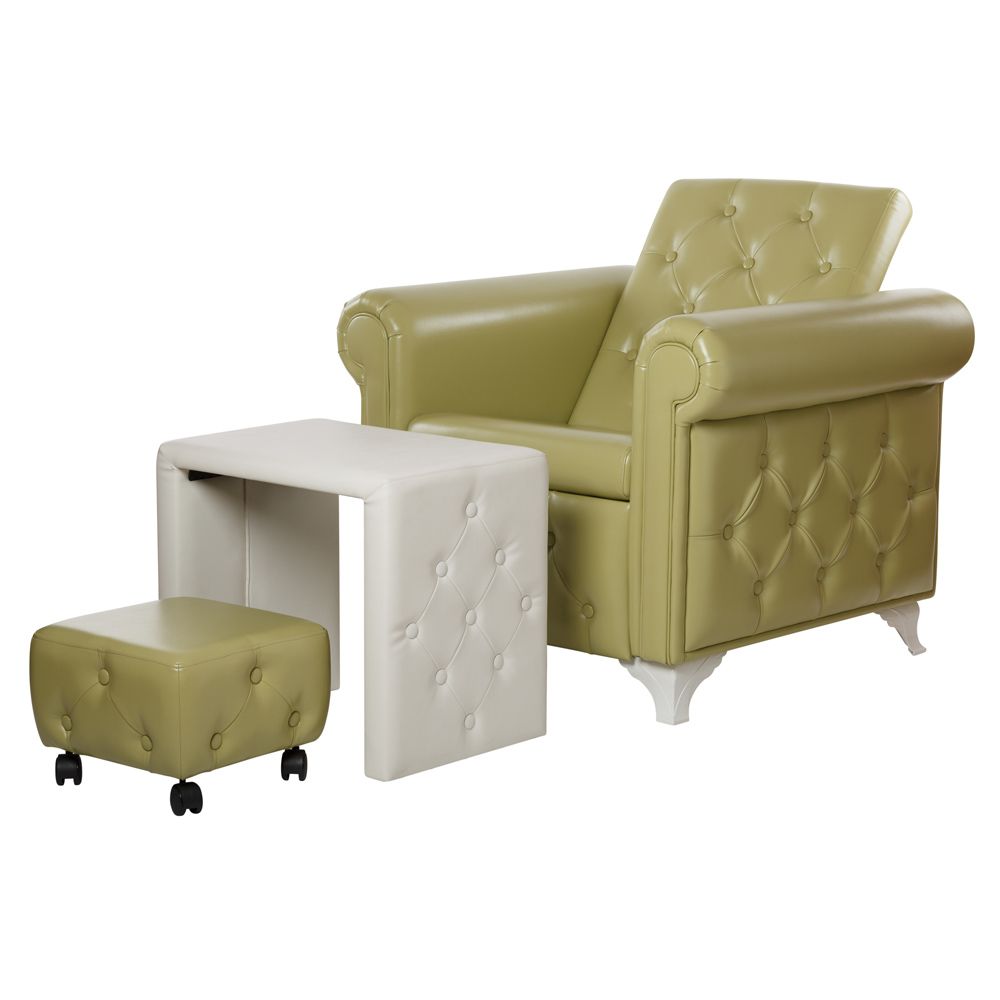 Педикюрная подножка для клиента на подпятниках с декоративными пуговицами по боковым сторонам.