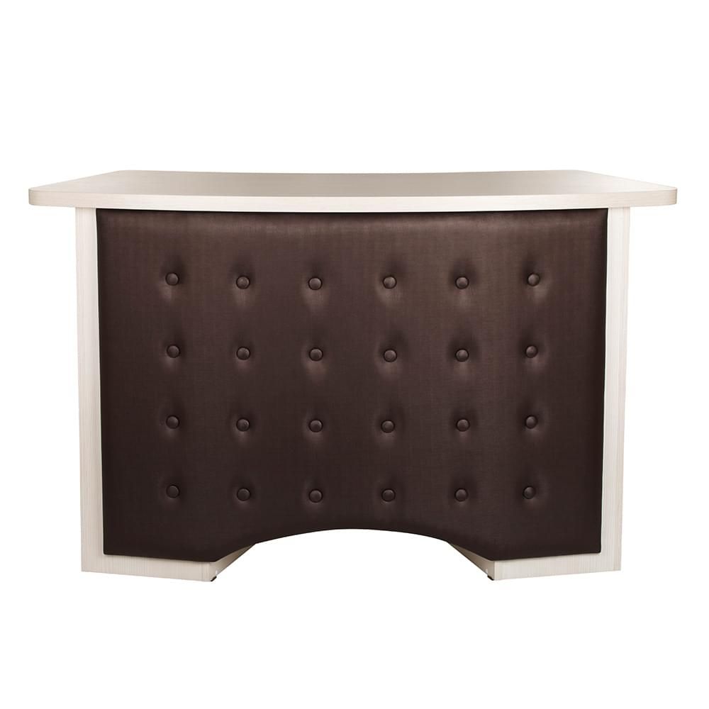 Стойка администратора «Мелодия» – элемент одноименного комплекта. Но ее можно купить и отдельно. Она выполнена на основе прочного долговечного ЛДСП, а обивка – каретная стяжка из кожзама, которая занимает практически всю площадь фронтальной поверхности. С внутренней стороны размещена рабочая площадь для администратора. Здесь можно расположить ноутбук, телефон, документы, канцелярию и прочее – все, что только может понадобиться в работе.