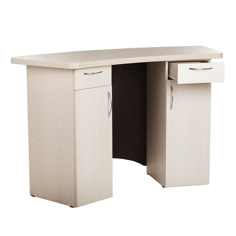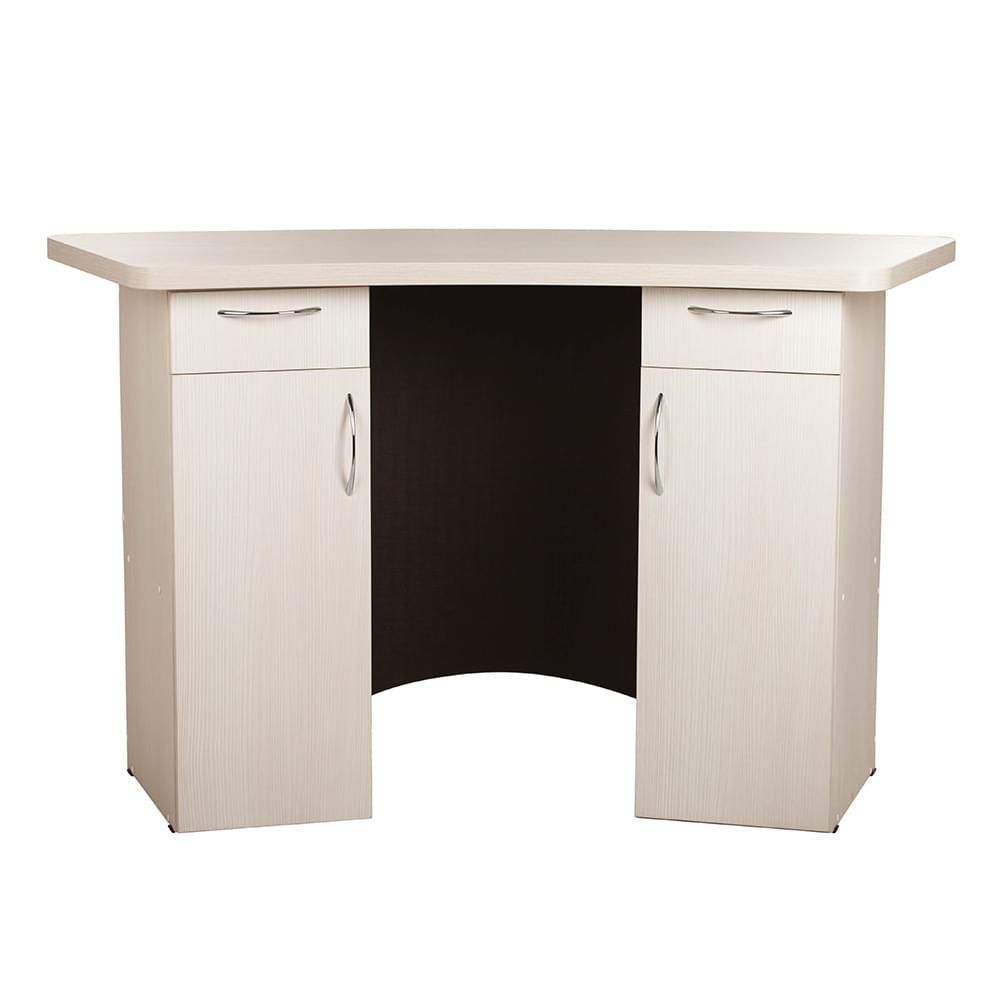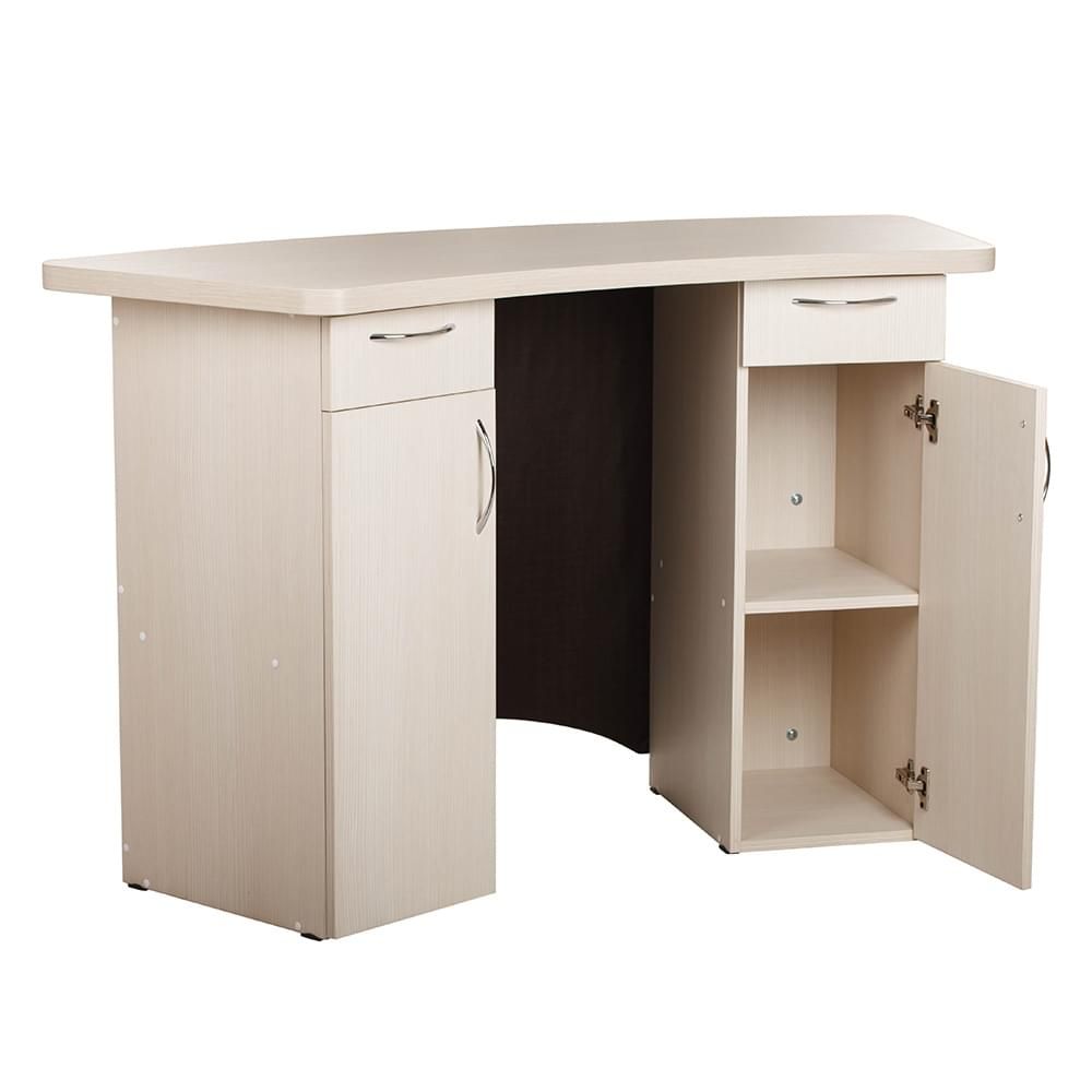 Администраторская стойка «Соната» сразу же привлекает к себе внимание. Каретная стяжка с мягкой текстурой выглядит современно и стильно, придает вашему заведению статуса и изысканности. Дополнительный эффект достигается за счет использования элегантных резных ножек, выступающих в роли некоего акцентного элемента. Со стороны администратора практически всю площадь занимают полочки и дверки, где можно разместить все для работы и личные вещи, если надобность в этом есть. Цвета отделки можно выбрать практически любые, что позволяет реализовать самые креативные идеи и придать вашей парикмахерской или салону красоты больше индивидуальности.