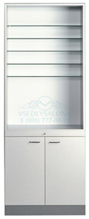 Парикмахерский шкаф SMERALDO двойной выполнен из ламината, верхняя часть комплектуется пятью полками из стекла, в нижней части имеется узкий выдвижной ящик и тумбы с дверцами. Цвет: серый, белый, черный.
