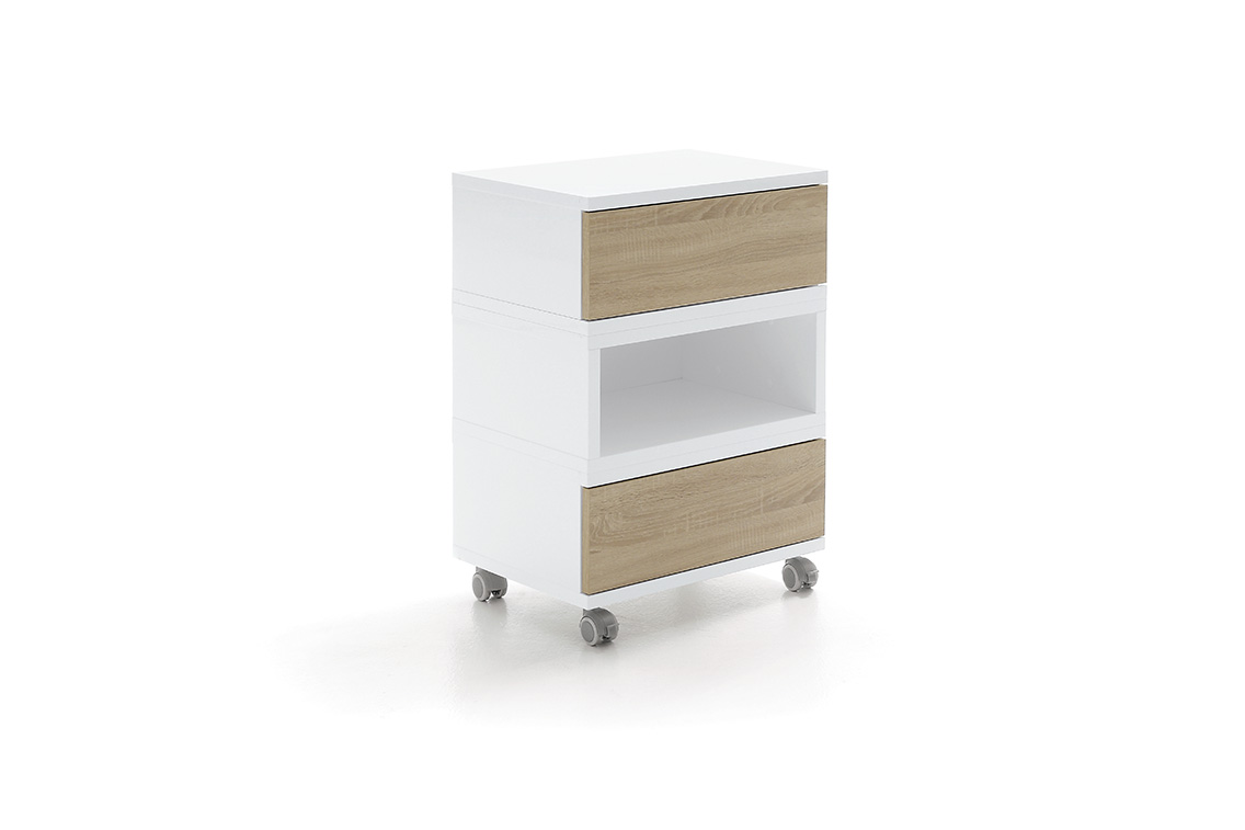 СПА-тележка «Swing» выполнена из белого глянцевого меламина. Данный материал отличается высокой прочностью, сопоставимой с прочностными характеристиками деревянного шпона. Модель имеет два выдвижных ящика и расположенную между ними открытую полку. Все отсеки вместительные и подходят для хранения не только СПА-средств, но и полотенец. Благодаря наличию колес тележку можно легко перемещать.