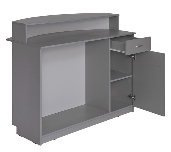 Администраторская стойка «Соната» сразу же привлекает к себе внимание. Каретная стяжка с мягкой текстурой выглядит современно и стильно, придает вашему заведению статуса и изысканности. Дополнительный эффект достигается за счет использования элегантных резных ножек, выступающих в роли некоего акцентного элемента. Со стороны администратора практически всю площадь занимают полочки и дверки, где можно разместить все для работы и личные вещи, если надобность в этом есть. Цвета отделки можно выбрать практически любые, что позволяет реализовать самые креативные идеи и придать вашей парикмахерской или салону красоты больше индивидуальности.