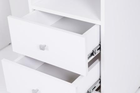 Тумба оснащена полкой и тремя выдвижными ящиками.