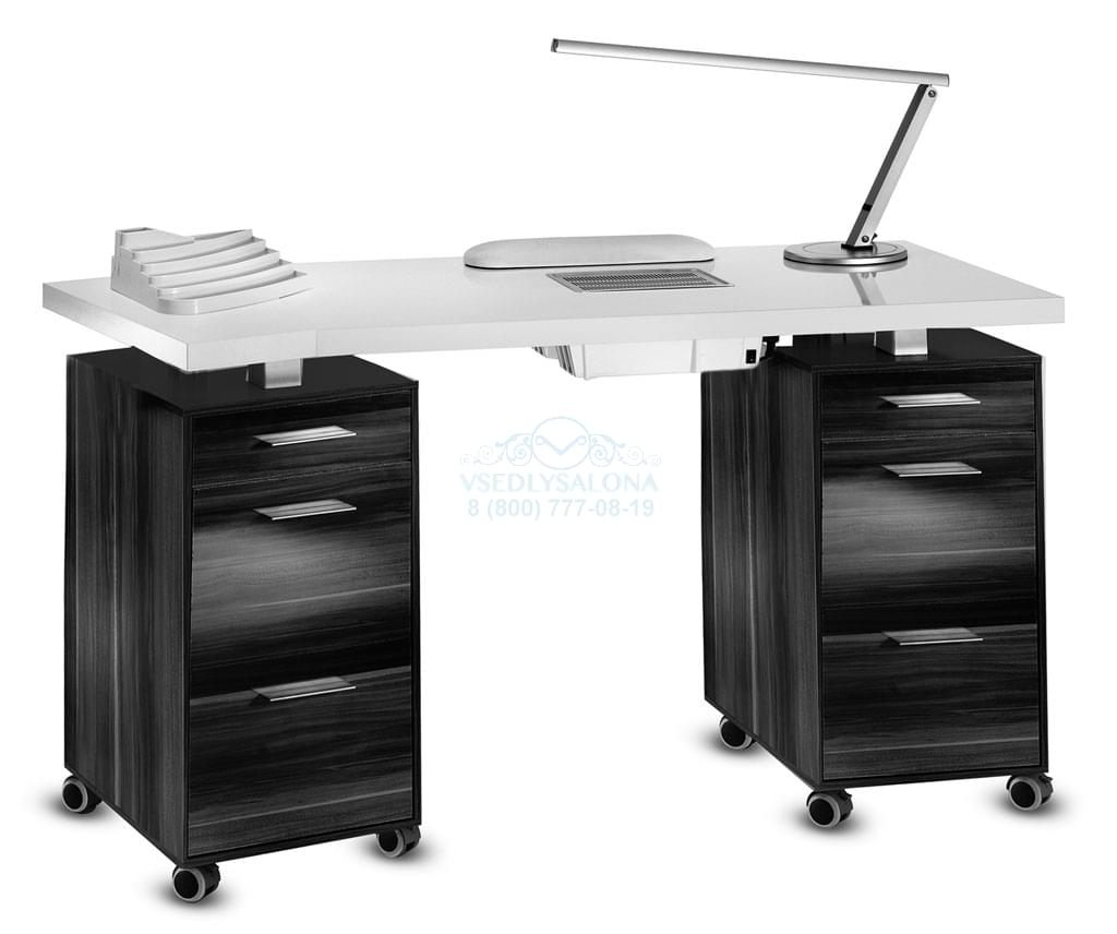 Оригинальный маникюрный стол с двумя тумбами, столешница покрыта белым лаком, тумбы ламинированные с 3 - мя выдвижными ящиками, на колесах. В комплекте: лампа, подушка маникюрная, подставка под лаки. Цвет стола: столешница белая /тумба орех. Размер: 148x56x79