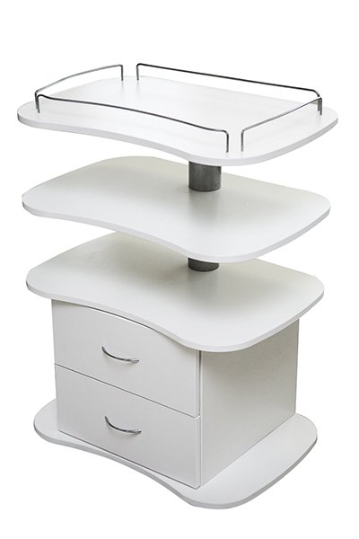 Столик косметолога — необходимая вещь в салоне красоты.При использовании аппаратуры открытые боковины позволяют легко подключать провода. За счет активного воздухообмена происходит быстрое и естественное охлаждение нагревающихся деталей и поверхностей аппаратуры. Верхняя полка снабжена изящными ограничителями. Два удобных ящика полного открывания на шариковых направляющих позволят мастеру без труда убирать необходимые для работы аксессуары. Для удобства уборки и перемещения столик изготавливается на колесиках.