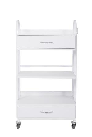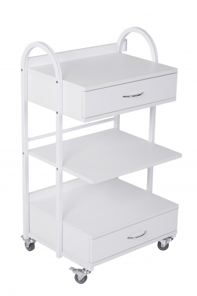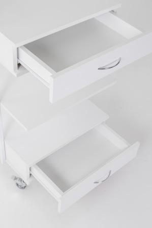 Столик для профессионального использования на металлическом каркасе белого цвета с одной полкой из ЛДСП, двумя выдвижными ящиками и специальным креплением для лампы-лупы. Столик оснащен колесиками, благодаря которым его легко можно передвигать и ваши инструменты всегда будут под рукой. Идеально подойдет для педикюрного, косметологиче- ского и массажного кабинетов.