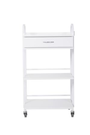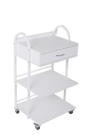 Столик для профессионального использования на металлическом каркасе белого цвета с двумя полками из ЛДСП, выдвижным ящиком и специальным креплением для лампы-лупы. Столик оснащен колесиками, благодаря которым его легко можно передвигать и ваши инструменты всегда будут под рукой. Идеально подойдет для педикюрного, косметологиче- ского и массажного кабинетов.