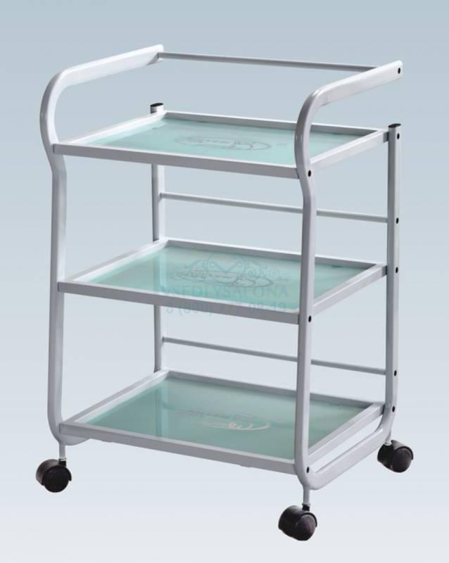 Столик для профессионального использования на металлическом каркасе белого цвета c тремя стеклянными полками. Подходит в кабинеты: косметологический, педикюрный, массажный и СПА процедур.