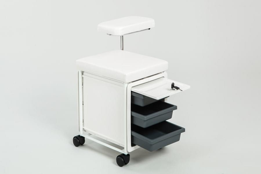 Стойка маникюрная CIAK MANICURE COLOR – не только небольшого размера, но и вместительная, выполнена в приятных бежевых тонах. Основной материал изготовления – пластик, но сидение обтянуто искусственной кожей отменного качества, что говорит о комфорте. Для хранения вещей и инструментов предусмотрено три выдвижных ящика, а регулируемая по высоте полочка позволит выполнять работу удобно и быстро.