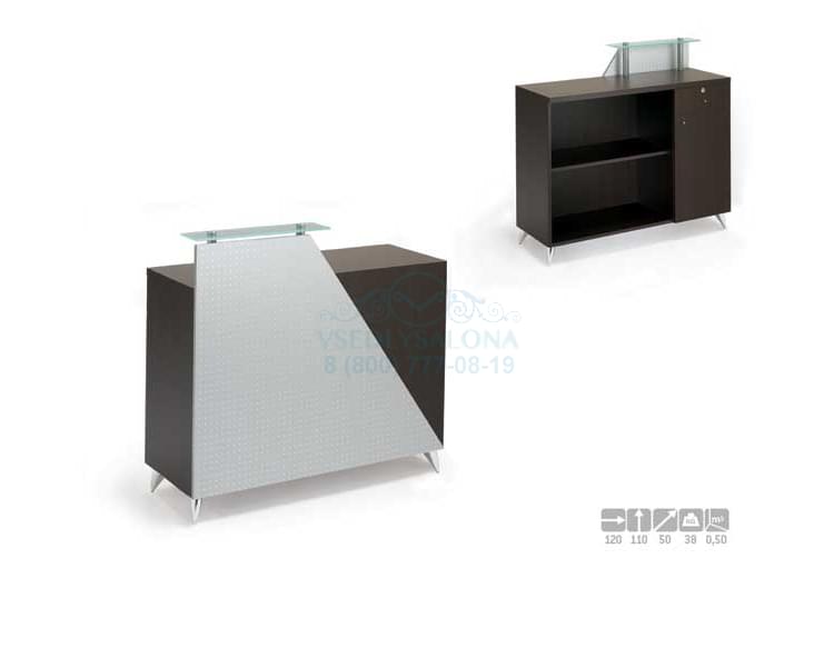 Стойка администратора на металлических ножках выполнена из ламината цвета венге. Фасад изготовлен из серого пластика с верхней стеклянной столешницей. Комплектуется двумя открытыми полками, тумбой с дверцей и выдвижным ящиком с замком. Размер (ДхШхВ):120х50х110