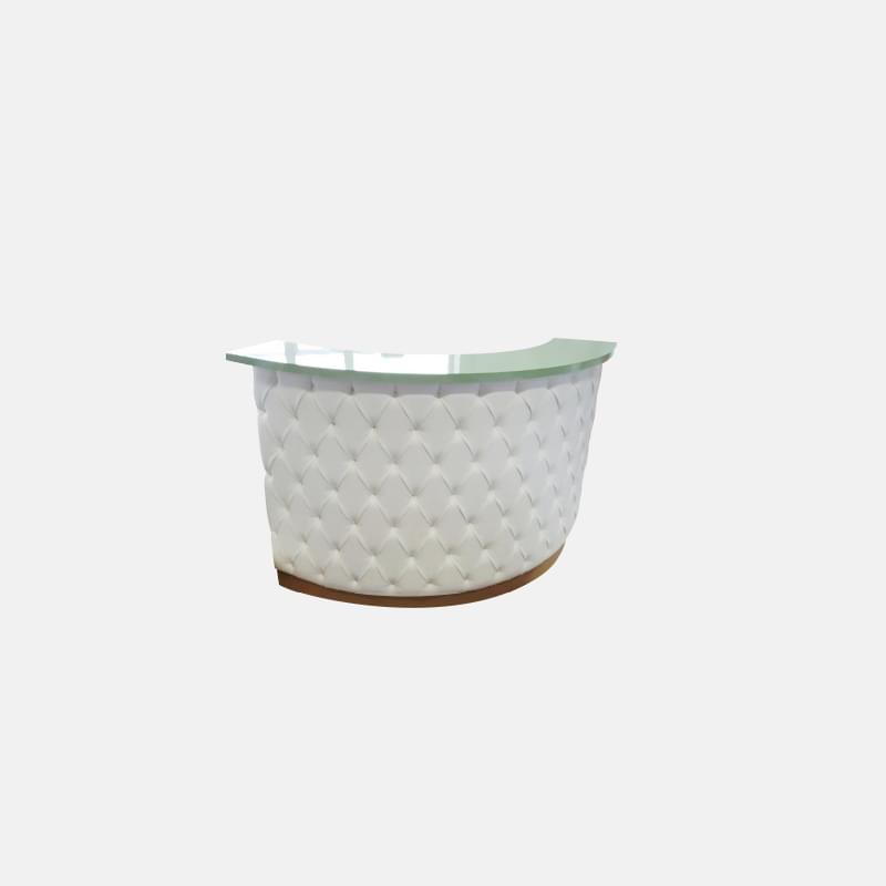 Стойка администратора Маттиа – по-настоящему шикарное и царское решение для любого салона красоты. Данная модель придает шика, подчеркивает индивидуальный стиль. И все за счет полукруглой формы и небольшого размера, использования ЛДСП и натуральной кожи белоснежного оттенка при изготовлении. Главная изюминка – каретная стяжка в виде декора.