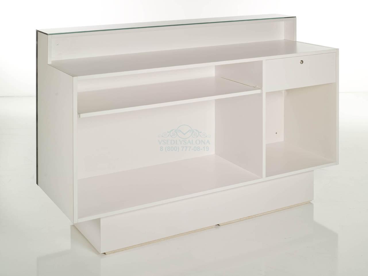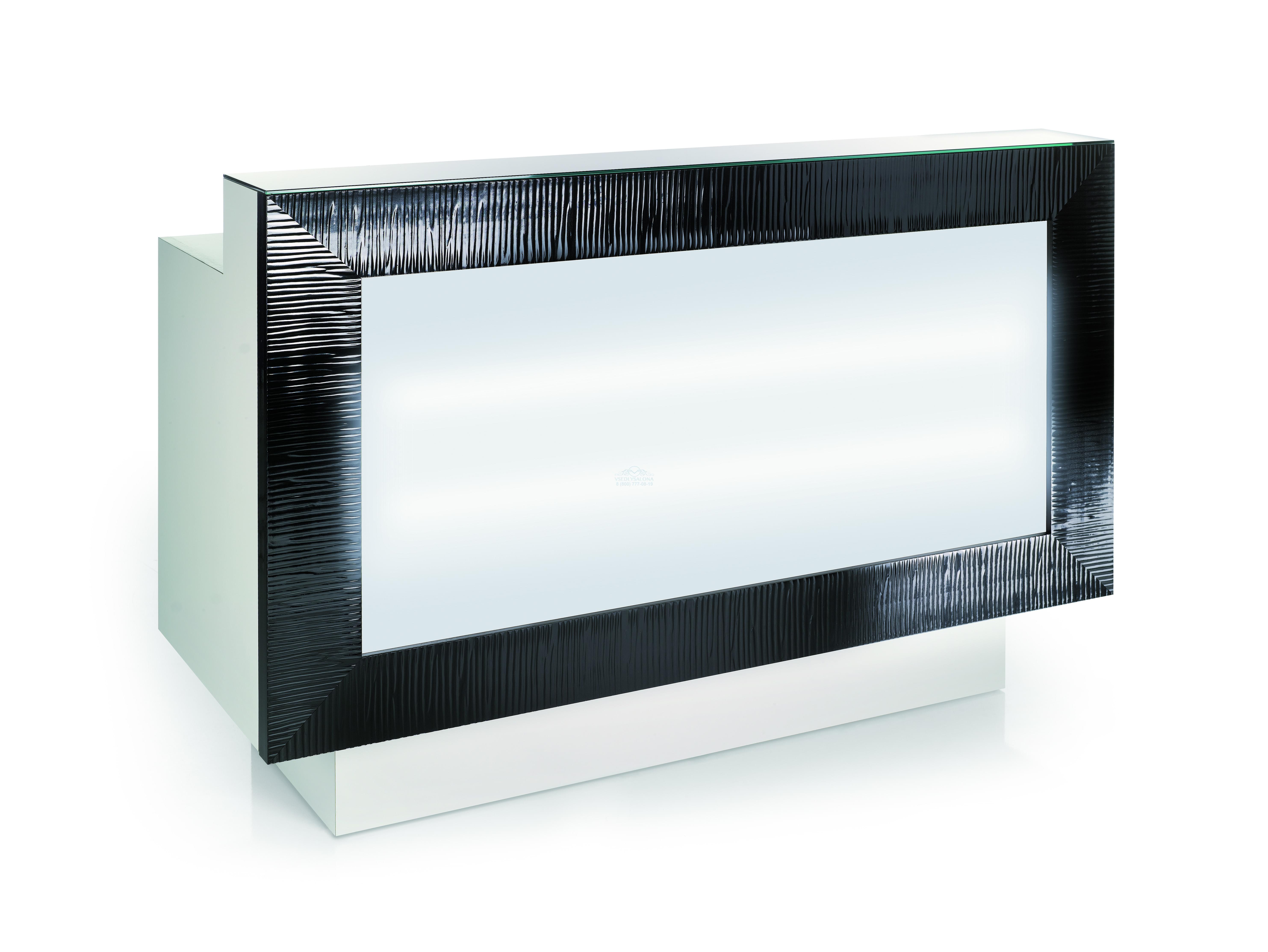 Стойка администратора. Фасад из белого оргстекла с подсветкой, рама цвет чёрный или белый, тумба из дерева.