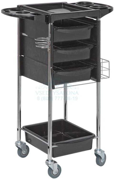 Тележка парикмахерская черного цвета на колесах, с тремя выдвижными ящиками, одной нижней полкой и двумя дополнительными панелями с отверстиями для чаш и брашеров, фенодержатель. Размер 38х37х87